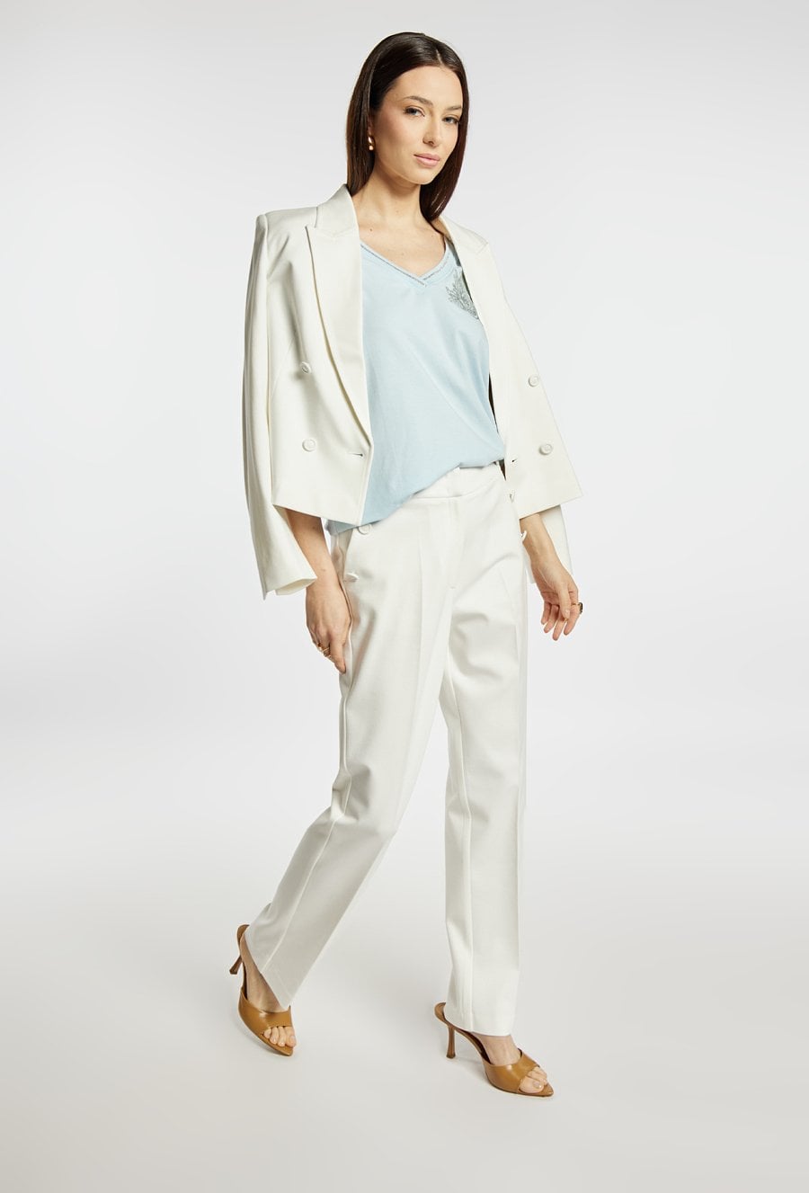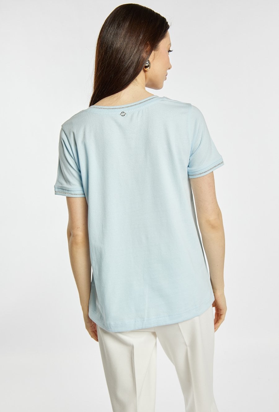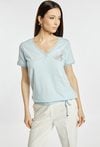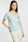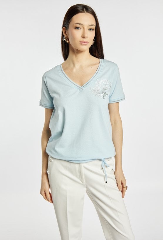 T-shirt damski o swobodnym kroju. T-shirt z krótkim rękawem oraz dekoltem w kształcie litery V, wykończonym subtelną lamówką. Na przodzie znajduje się delikatny, jasny wzór, który nadaje całości eleganckiego charakteru. Dół wykończony ściągaczem z wiązaniem. Modelka na zdjęciu ma 177 cm wzrostu i prezentuje rozmiar S.