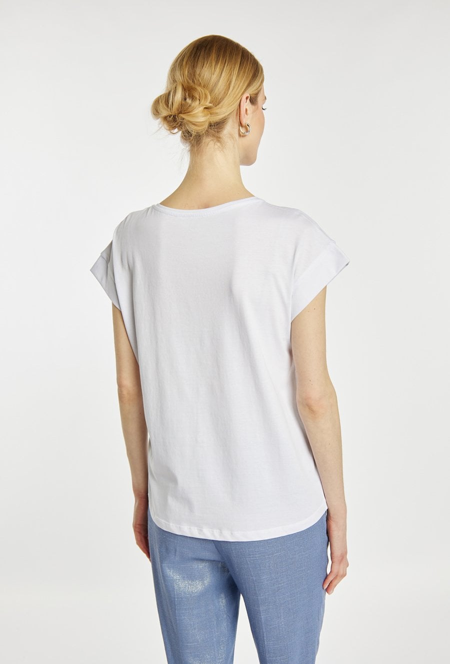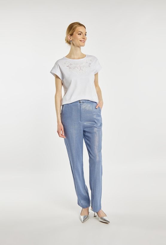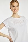T-shirt damski o prostym, komfortowym kroju z krótkim rękawem. Model z klasycznym, półokrągłym dekoltem, który nadaje całości uniwersalnego charakteru. Ozdobna, ażurowa aplikacja przy dekolcie dodaje subtelnej elegancji i kobiecego uroku. Modelka na zdjęciu ma 177 cm wzrostu i prezentuje rozmiar S.
