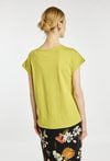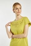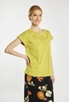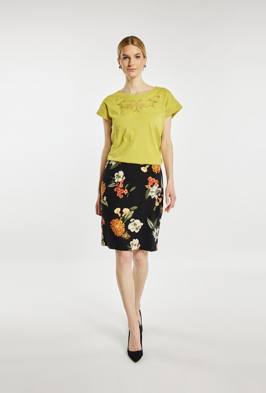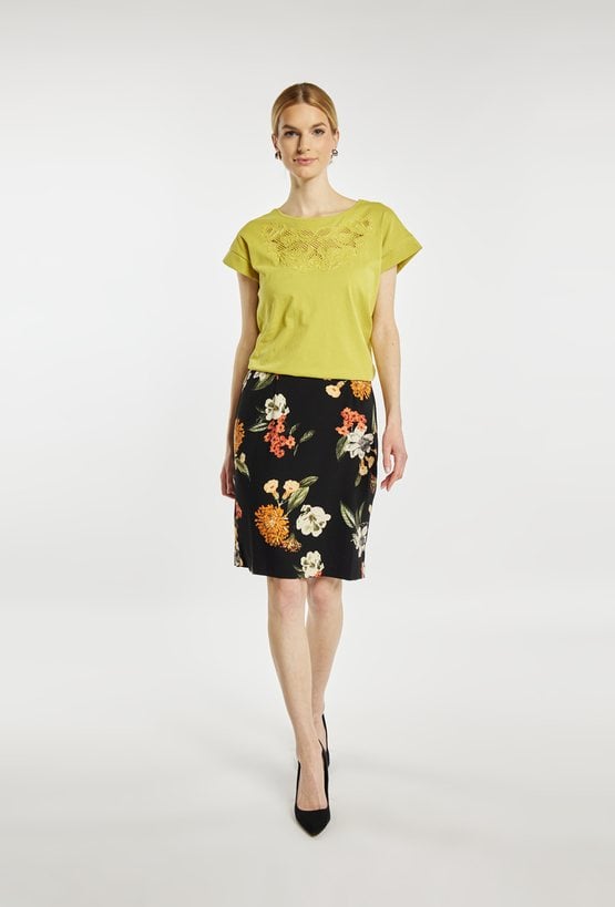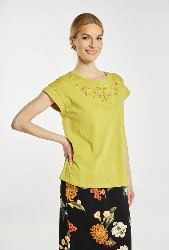 T-shirt damski o prostym, komfortowym kroju z krótkim rękawem. Model z klasycznym, półokrągłym dekoltem, który nadaje całości uniwersalnego charakteru. Ozdobna, ażurowa aplikacja przy dekolcie dodaje subtelnej elegancji i kobiecego uroku. Modelka na zdjęciu ma 177 cm wzrostu i prezentuje rozmiar S.