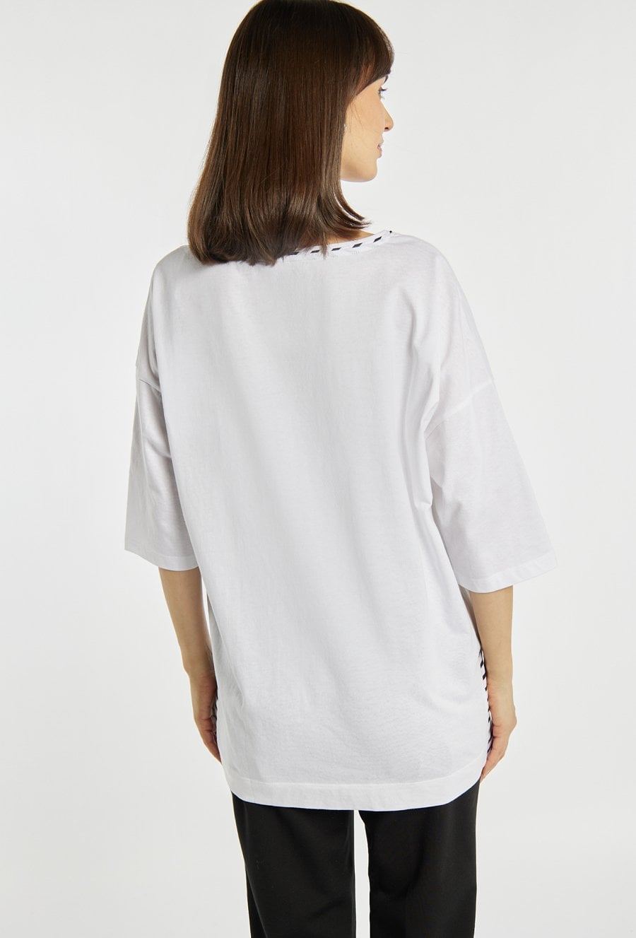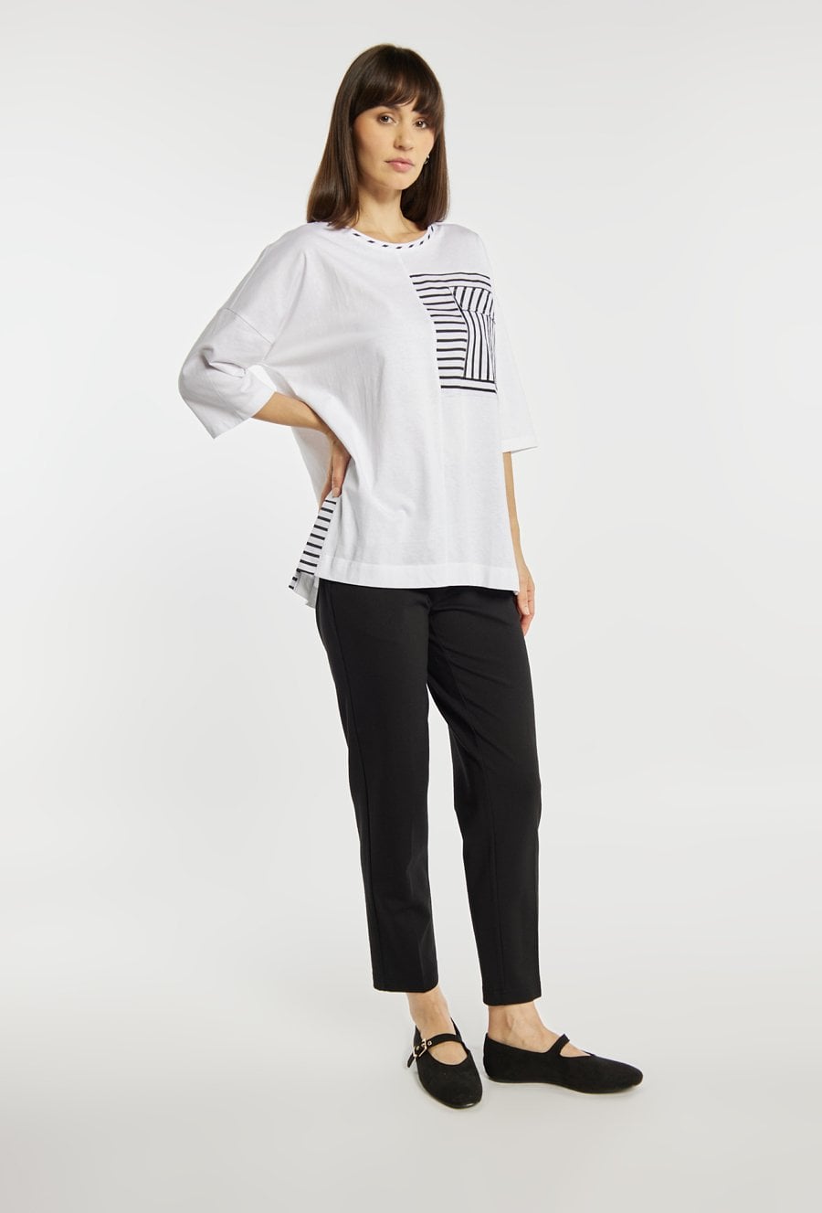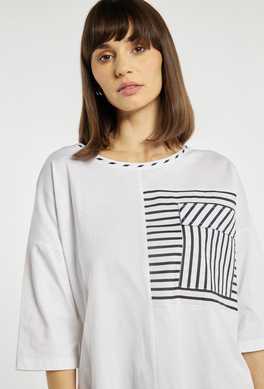 T-shirt damski wykonany z bawełny. T-shirt o luźnym kroju i rękawie do łokcia wyróżnia się kontrastowymi, geometrycznymi paskami oraz ozdobną kieszonką, które nadają mu nowoczesnego, graficznego charakteru. Model idealny na co dzień, zapewniający wygodę i swobodę noszenia. Modelka na zdjęciu ma 177 cm wzrostu i prezentuje rozmiar S.