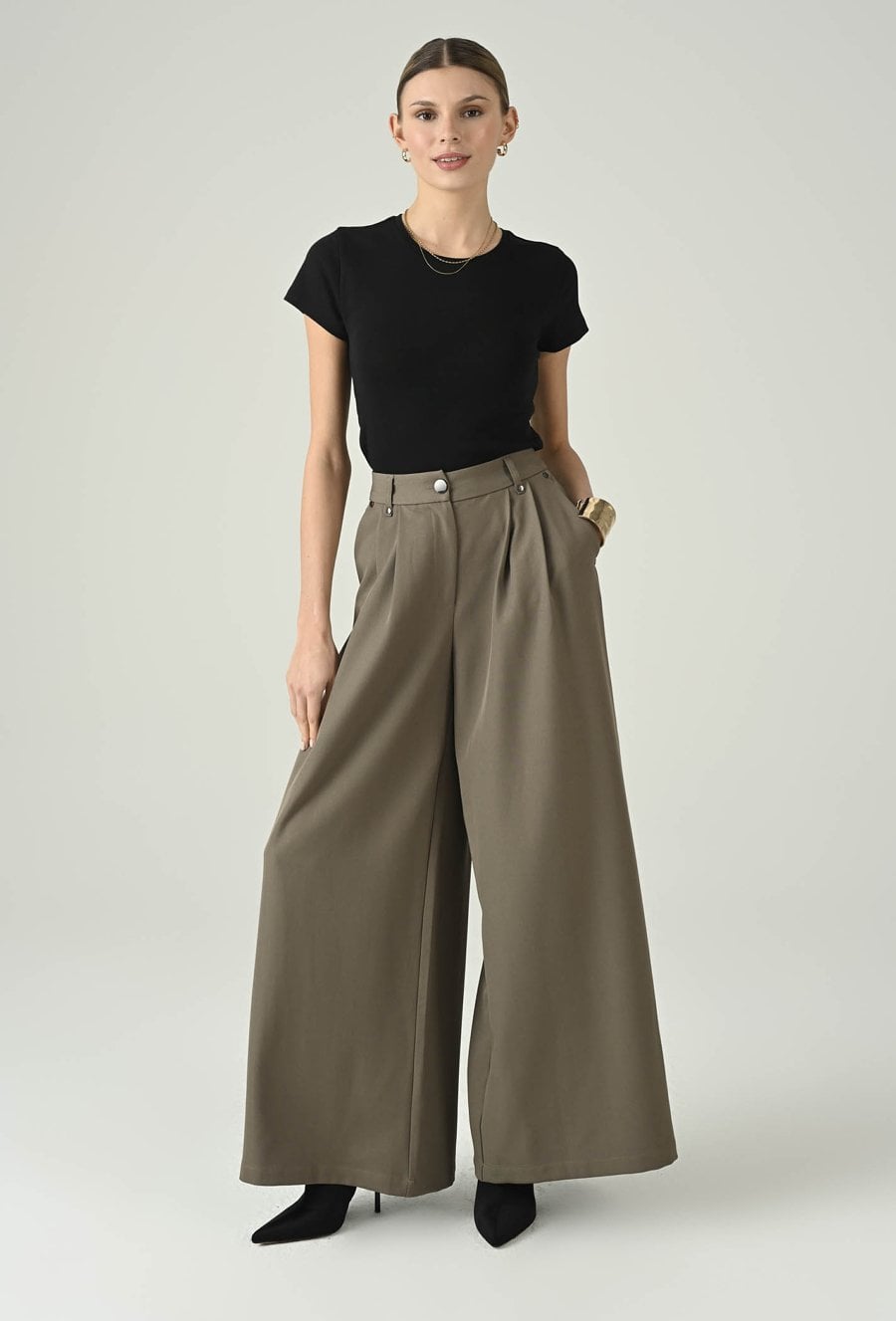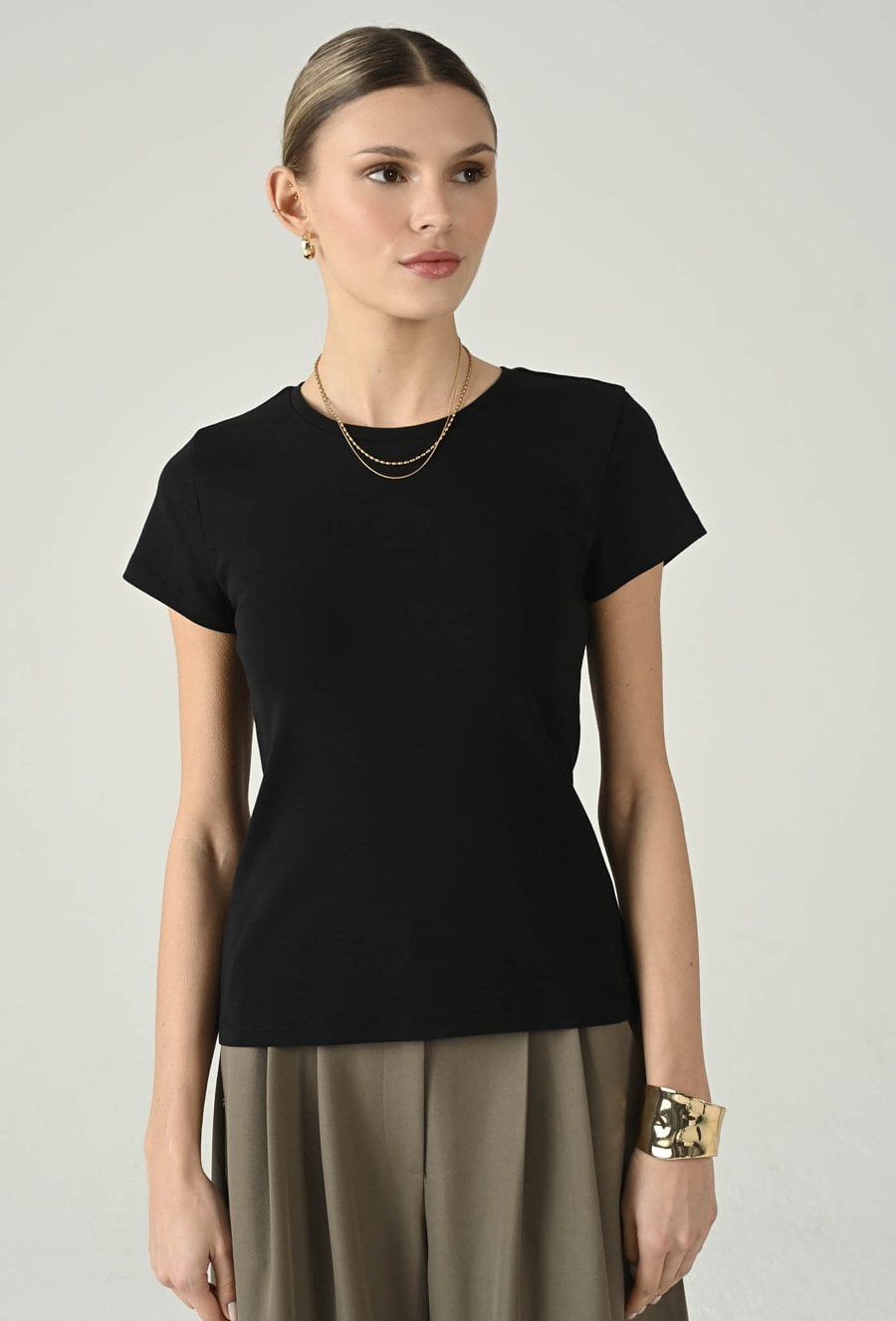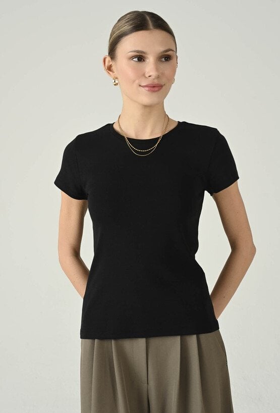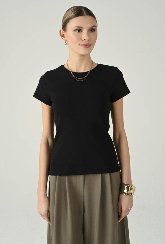 Ponadczasowy t-shirt, który sprawdzi się jako uniwersalna baza w każdej garderobie. Klasyczny, okrągły dekolt i krótki rękaw nadają mu minimalistyczny charakter, a wygodny fason zapewnia komfort noszenia przez cały dzień. To model, który łatwo dopasujesz do różnych stylizacji — świetnie wygląda z jeansami, spodniami materiałowymi, pod marynarką lub kardiganem. Idealny na co dzień, do pracy w casualowym wydaniu i na weekendowe zestawy.