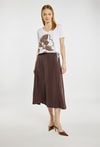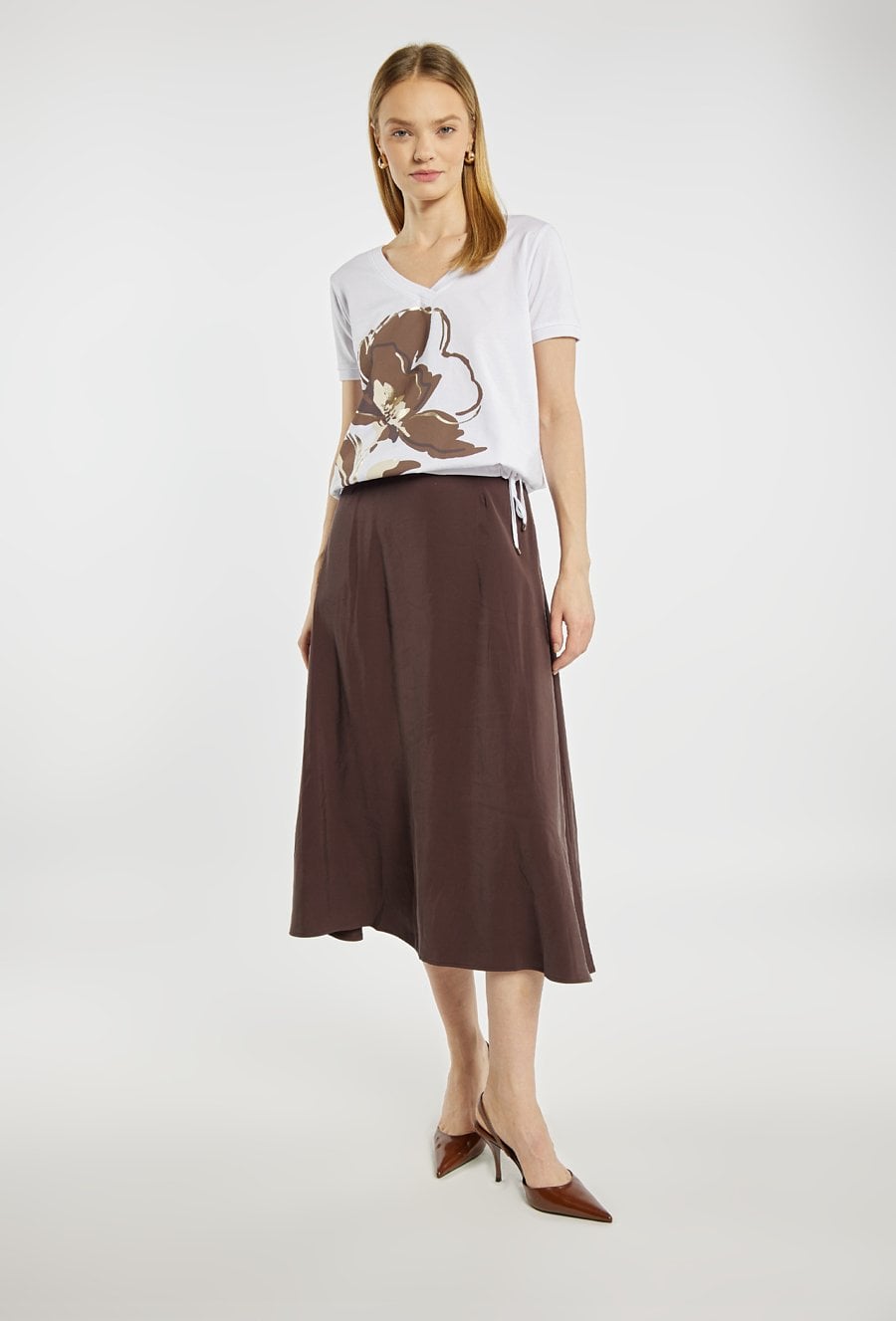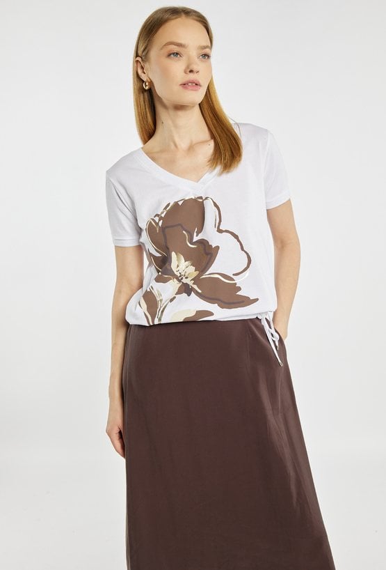 T-shirt damski o swobodnym, kobiecym fasonie. Model z dekoltem w serek oraz krótkimi rękawami. Z przodu ozdobiony efektownym, kwiatowym nadrukiem w stonowanej, brązowo-beżowej kolorystyce. Idealny do codziennych stylizacji. Modelka na zdjęciu ma 177 cm wzrostu i prezentuje rozmiar S.