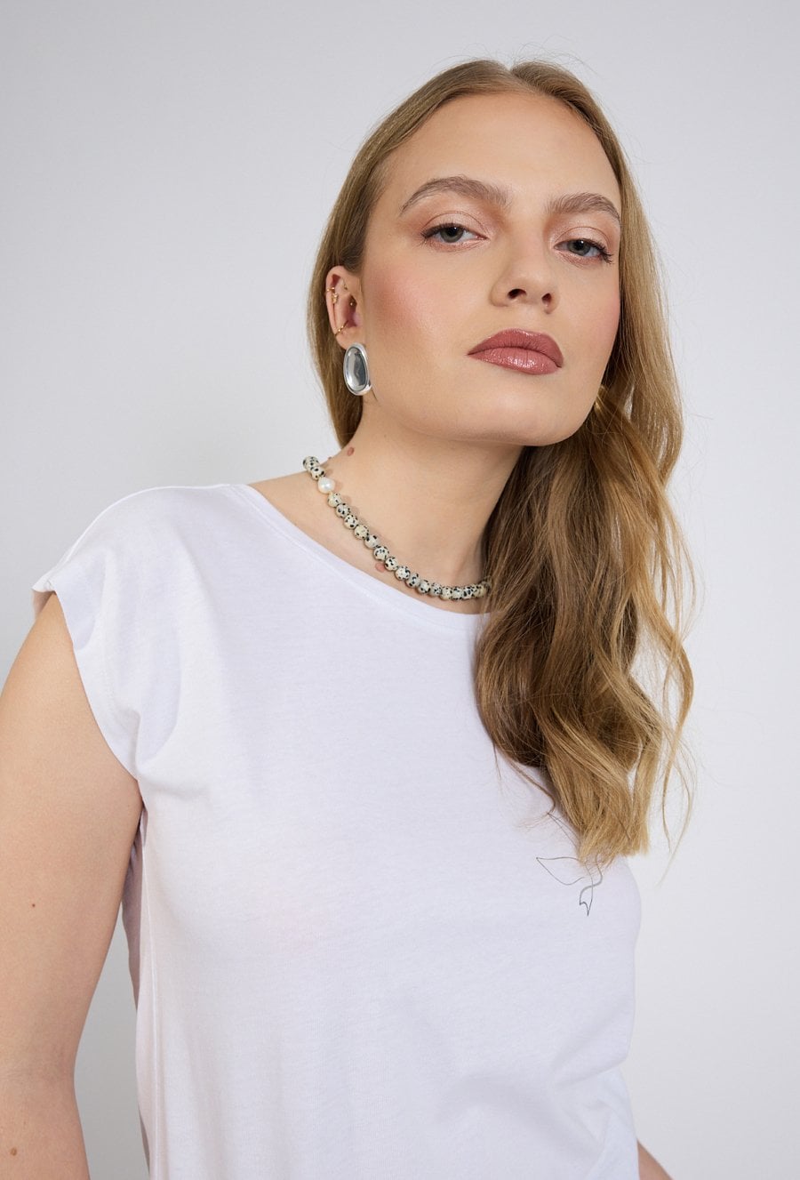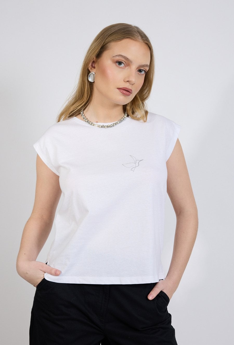 T-shirt damski o swobodnym, minimalistycznym kroju. Model z krótkim rękawem oraz klasycznym, zaokrąglonym dekoltem. Przód zdobi subtelny, niewielki nadruk z motywem ptaka, który nadaje koszulce delikatnego i nowoczesnego charakteru. Modelka na zdjęciu ma 177 cm wzrostu i prezentuje rozmiar S.