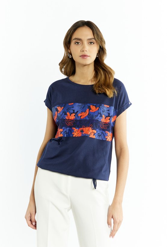 T-shirt damski z haftowym nadrukiem. T-shirt z krótkim rękawem, półokrągłym dekoltem oraz ściągaczem z wiązaniem. Model ten świetnie sprawdzi się na co dzień. Modelka na zdjęciu ma 177 cm wzrostu i prezentuje rozmiar S.