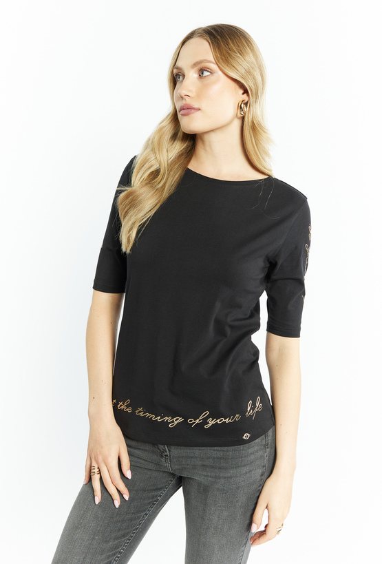 T-shirt damski wykonany z przyjemnej bawełny. T-shirt z krótkim rękawem oraz półokrągłym dekoltem. T-shirt wykończony ozdobnymi napisami. Model ten idealnie sprawdzi się na co dzień. Modelka na zdjęciu ma 177 cm wzrostu i prezentuje rozmiar S.
