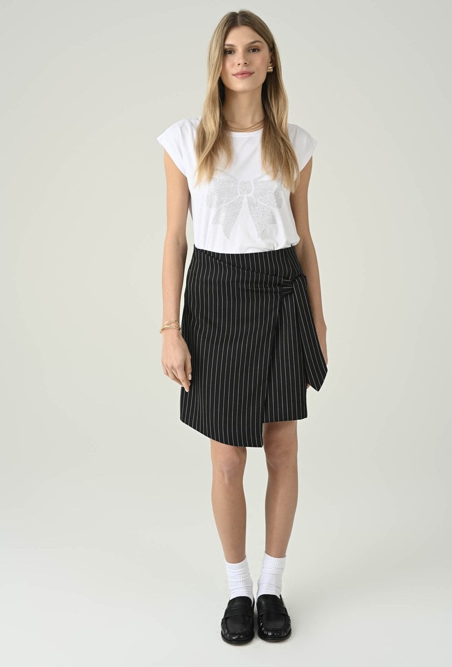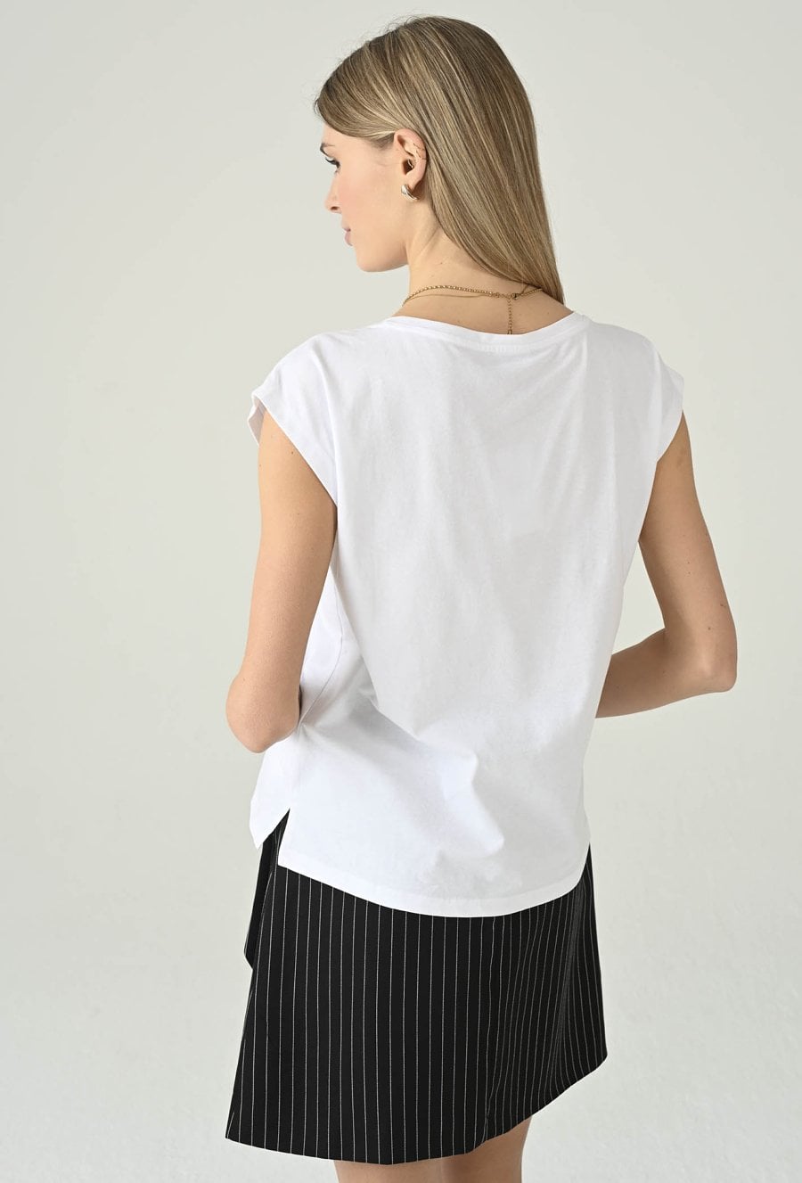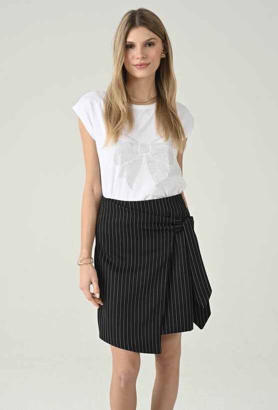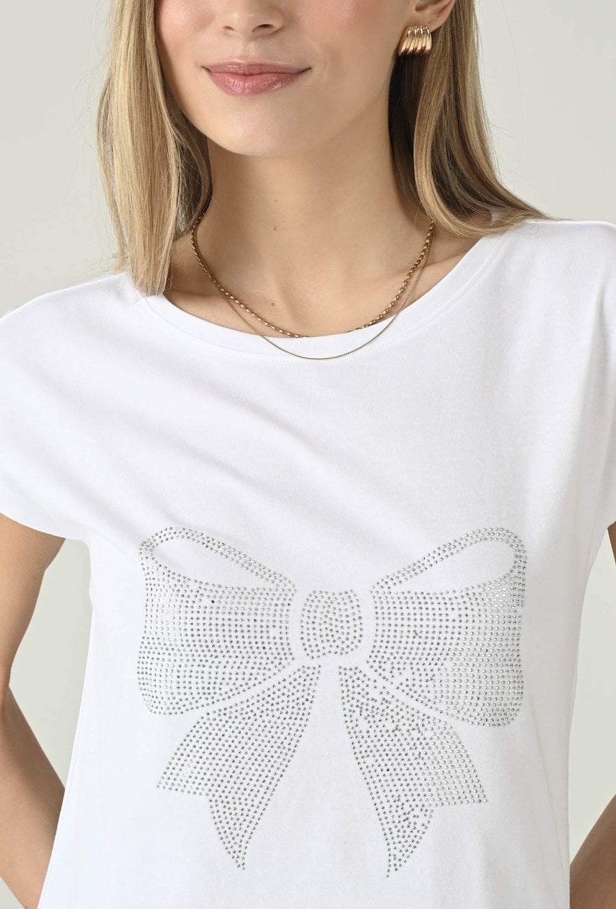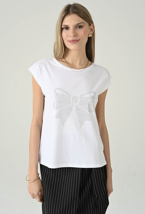 T-shirt damski o prostym, uniwersalnym kroju. Model z krótkim rękawem i klasycznym, okrągłym dekoltem. Przód zdobi efektowna aplikacja w kształcie kokardy z połyskujących dżetów, która nadaje całości eleganckiego charakteru. T-shirt damski z ozdobną aplikacją świetnie sprawdzi się w codziennych oraz bardziej stylowych zestawach. Modelka na zdjęciu ma 177 cm wzrostu i prezentuje rozmiar S.