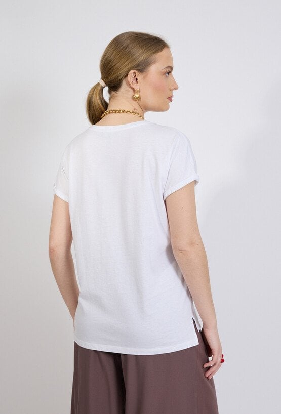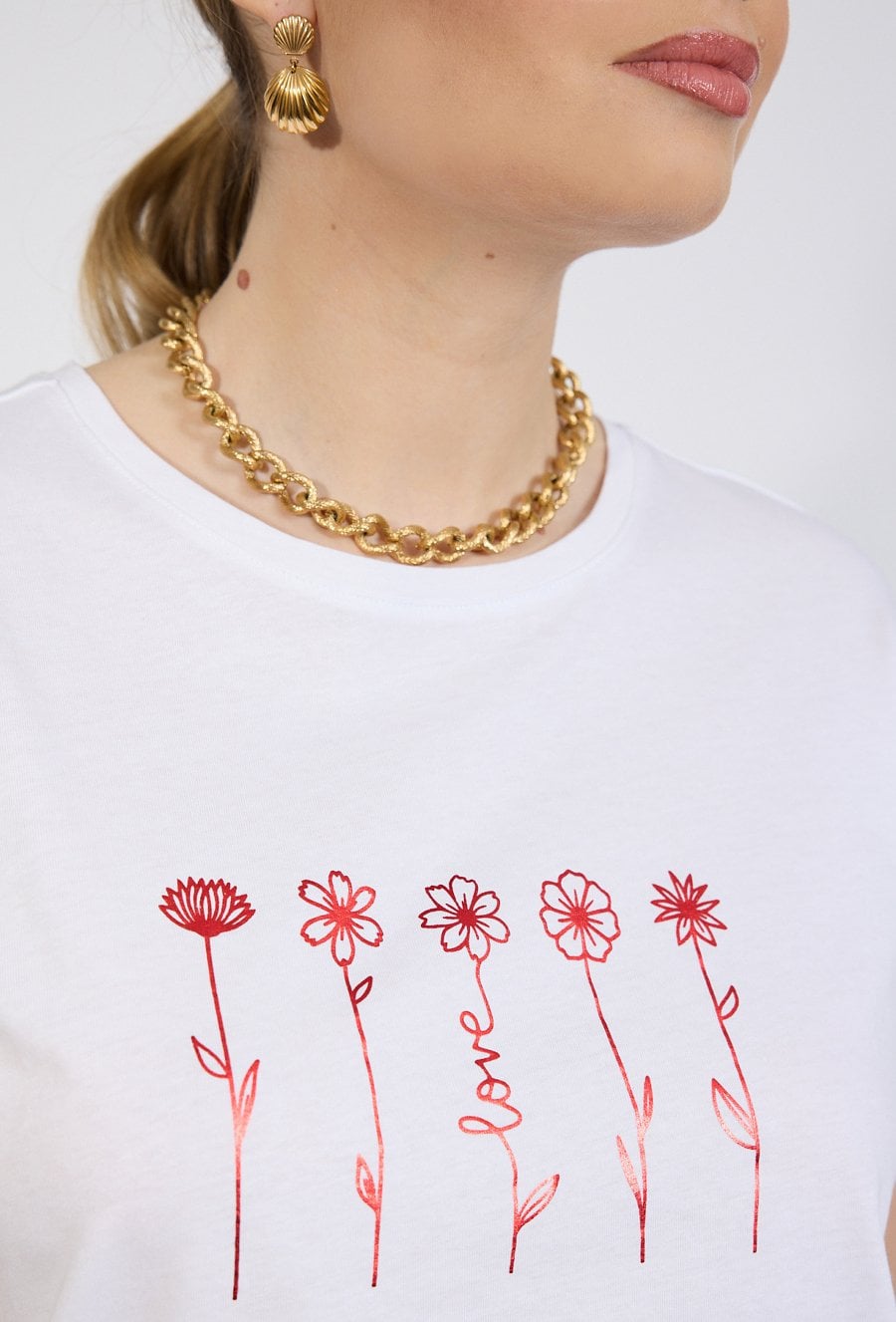 T-shirt damski o swobodnym, komfortowym kroju. Model z krótkim rękawem oraz klasycznym, zaokrąglonym dekoltem. Przód zdobi delikatny nadruk z motywem kwiatów. Świetnie prezentuje się w połączeniu z jeansami, spodniami materiałowymi lub spódnicą, tworząc wygodny i stylowy zestaw na co dzień. Modelka na zdjęciu ma 177 cm wzrostu i prezentuje rozmiar S.