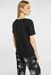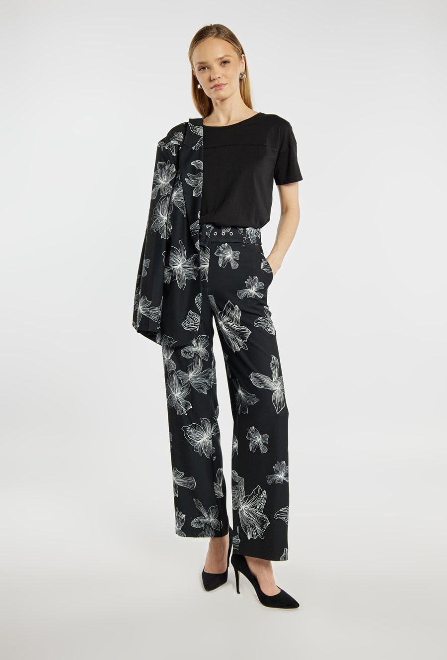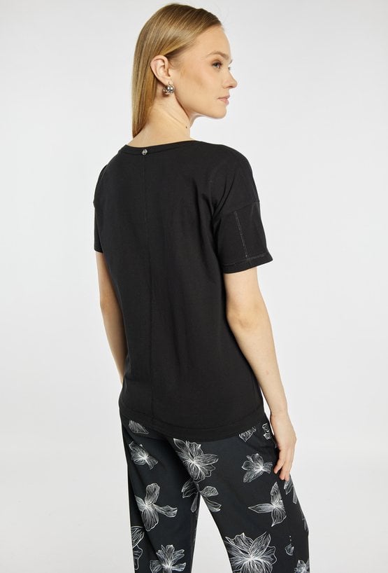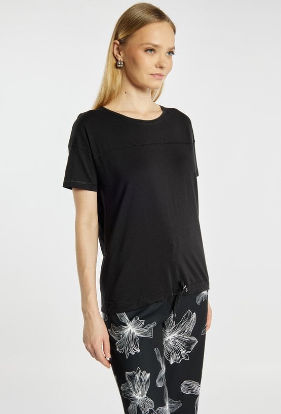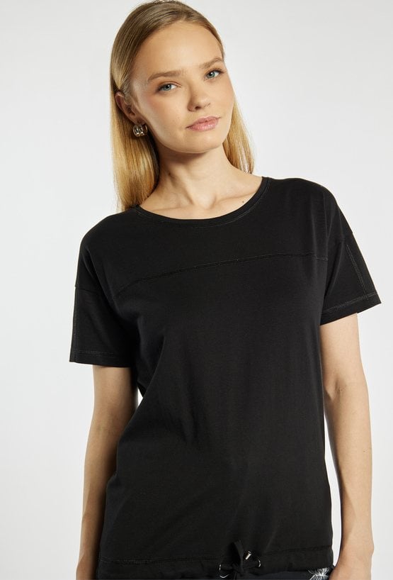 T-shirt damski o luźnym fasonie. Model z okrągłym dekoltem oraz krótkimi rękawami. U dołu koszulki znajduje się regulowane wiązanie, które pozwala dopasować fason do sylwetki i nadaje całości nowoczesnego charakteru. Idealny wybór do codziennych, casualowych stylizacji. Modelka na zdjęciu ma 177 cm wzrostu i prezentuje rozmiar S.