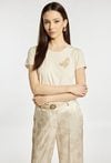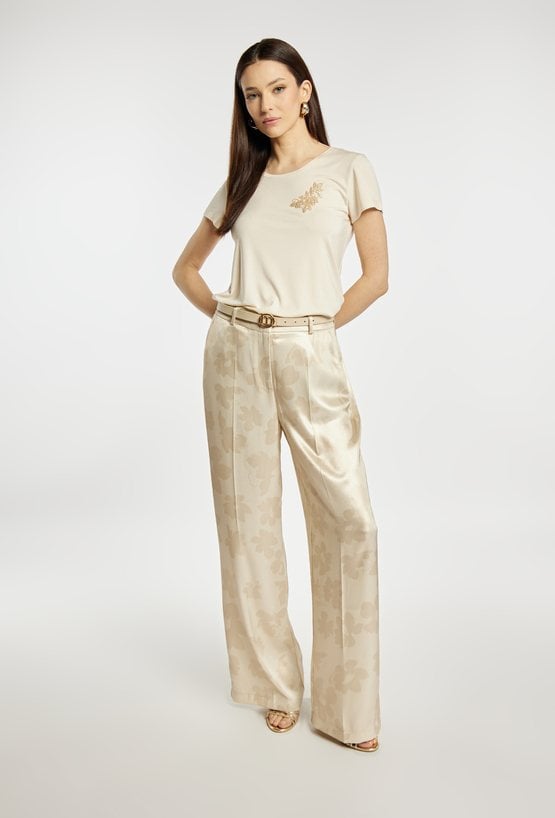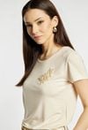 T-shirt damski o prostym, klasycznym kroju. Model z krótkim rękawem i okrągłym dekoltem. Przód ozdobiony subtelną, dekoracyjną aplikacją w delikatnym, eleganckim stylu. Uniwersalny fason sprawia, że T-shirt świetnie wygląda zarówno w casualowych zestawach, jak i w połączeniu z eleganckimi elementami garderoby. Modelka na zdjęciu ma 177 cm wzrostu i prezentuje rozmiar S.