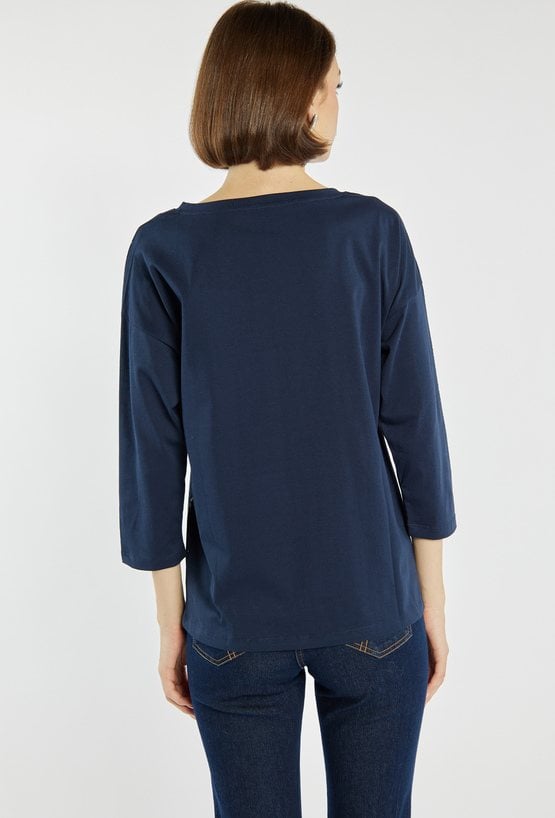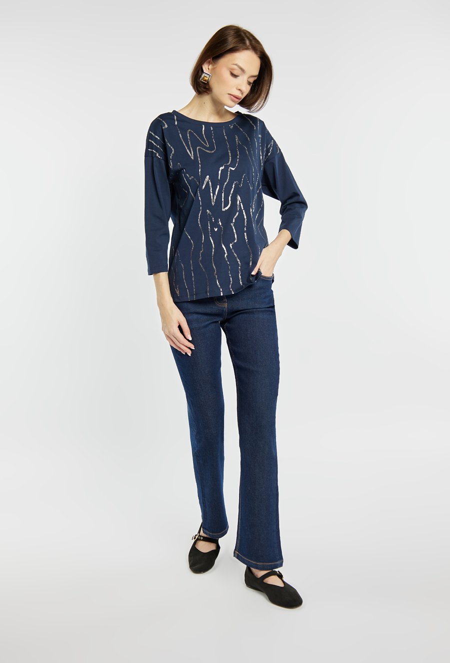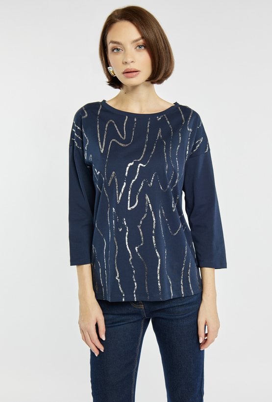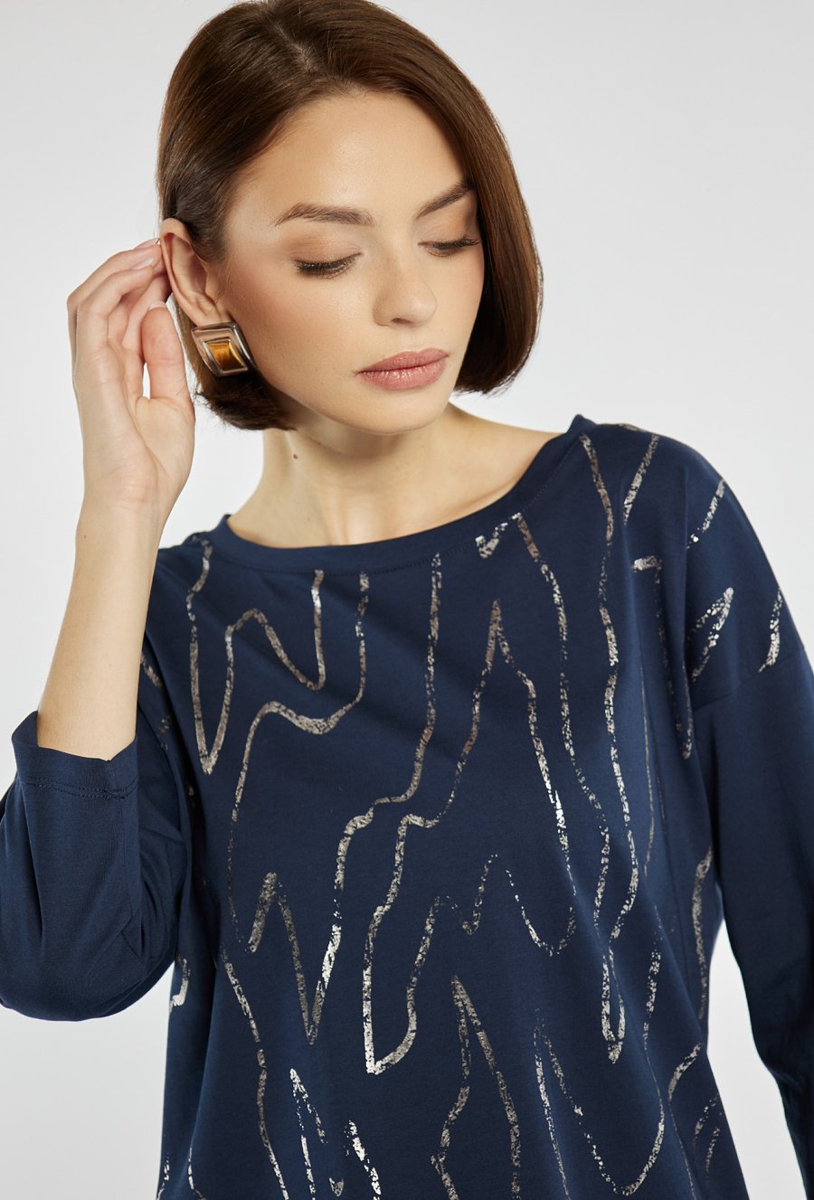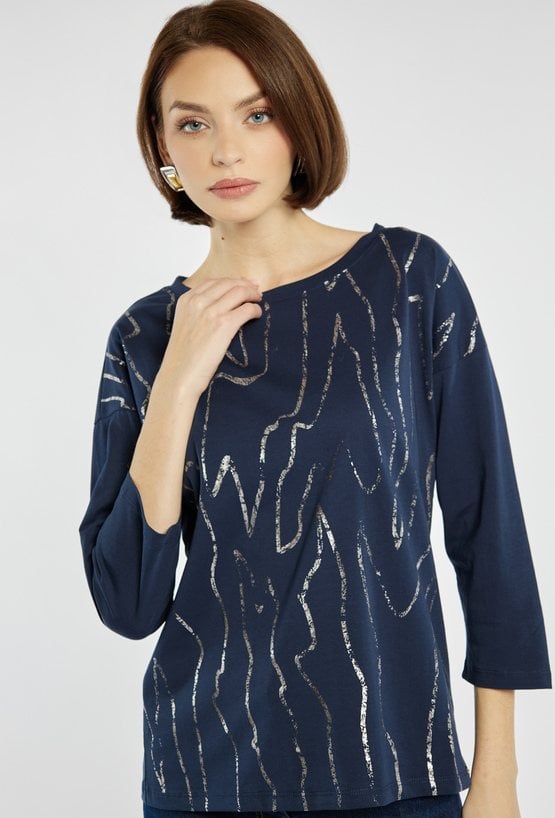 T-shirt z połyskującym, nieregularnym wzorem, który nadaje całości wyjątkowego charakteru. T-shirt z rękawem 3/4 i swobodnym krojem zapewnia komfort noszenia i świetnie dopasowuje się do sylwetki. Idealny wybór na co dzień lub na spotkania w eleganckim, ale niezobowiązującym stylu. Modelka na zdjęciu ma 177 cm wzrostu i prezentuje rozmiar S.