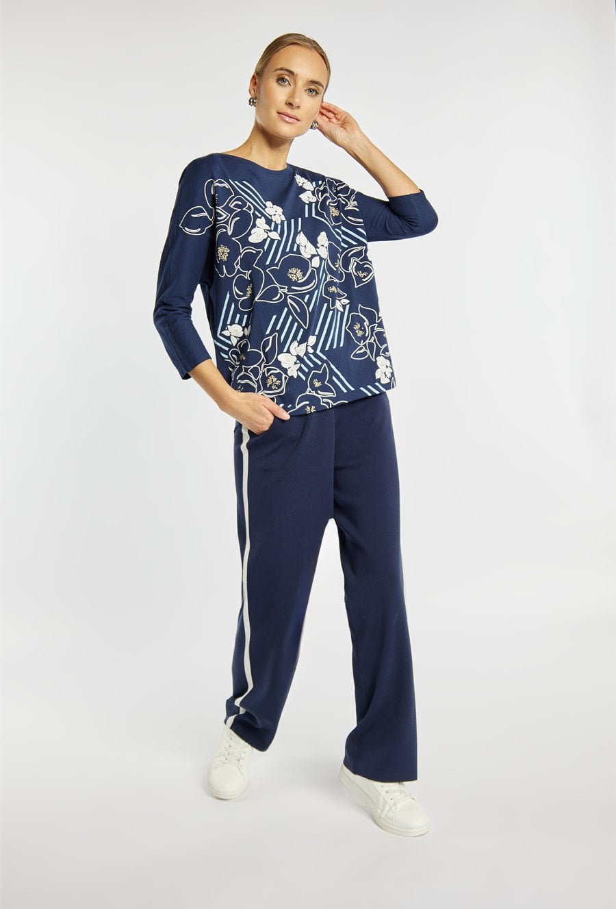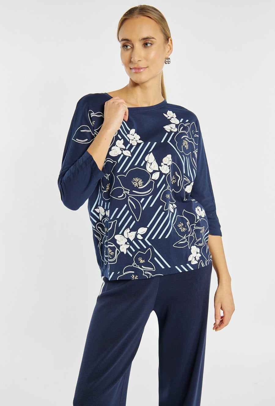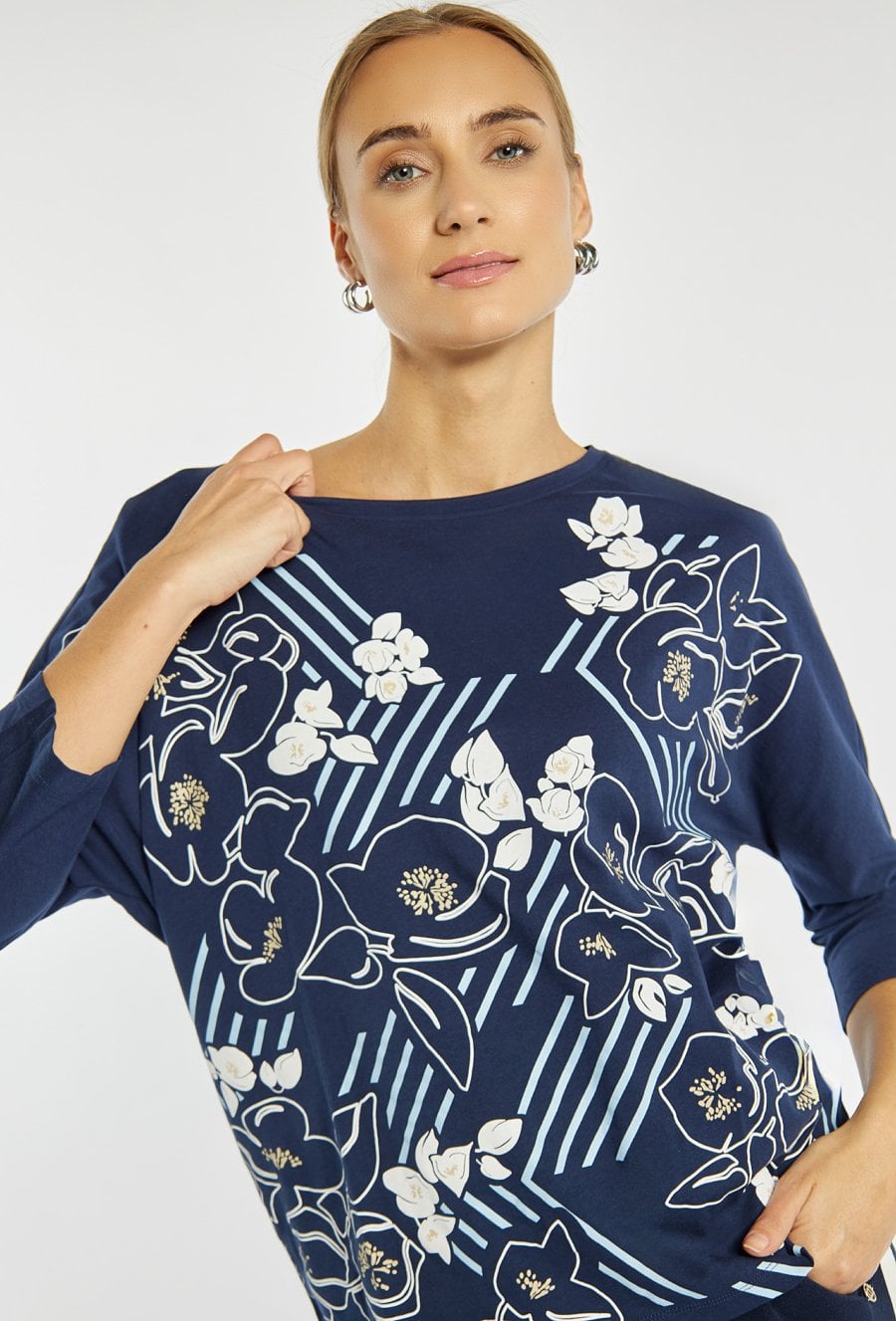 T-shirt z kwiatowym nadrukiem to kobieca i stylowa propozycja na co dzień. Luźny krój i rękawy 3/4 zapewniają wygodę, a efektowny wzór dodaje całości świeżości i oryginalnego charakteru. Idealny wybór do casualowych stylizacji z jeansami lub spodniami materiałowymi. Modelka na zdjęciu ma 177 cm wzrostu i prezentuje rozmiar S.