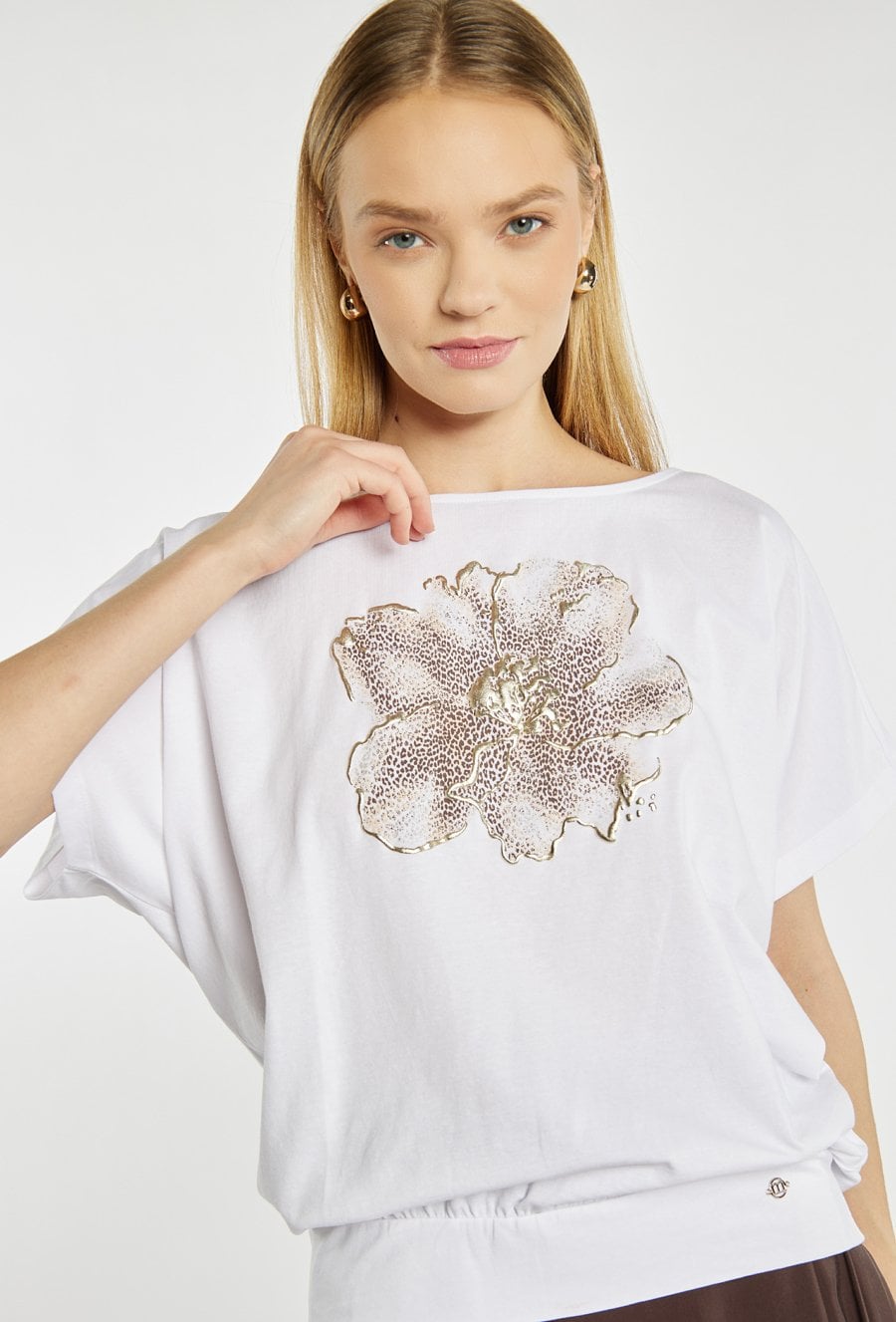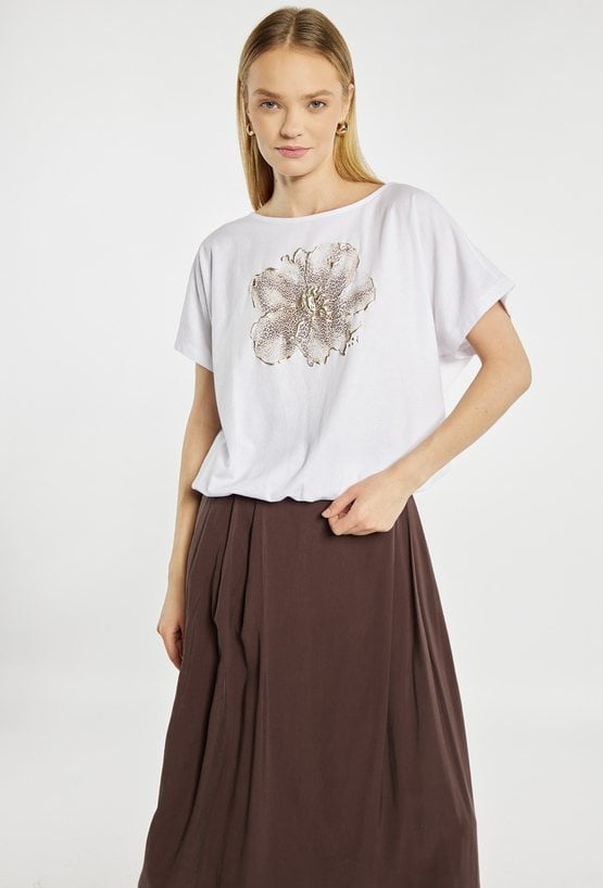 T-shirt damski o swobodnym, luźnym fasonie. T-shirt z okrągłym dekoltem oraz krótkimi rękawami. Z przodu ozdobiony efektownym, dużym motywem kwiatowym z delikatnym, złotym połyskiem, który nadaje całości eleganckiego i kobiecego charakteru. Modelka na zdjęciu ma 177 cm wzrostu i prezentuje rozmiar S.