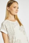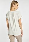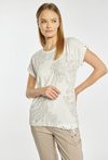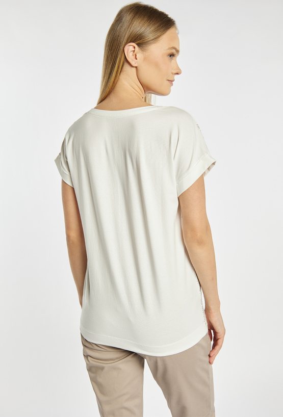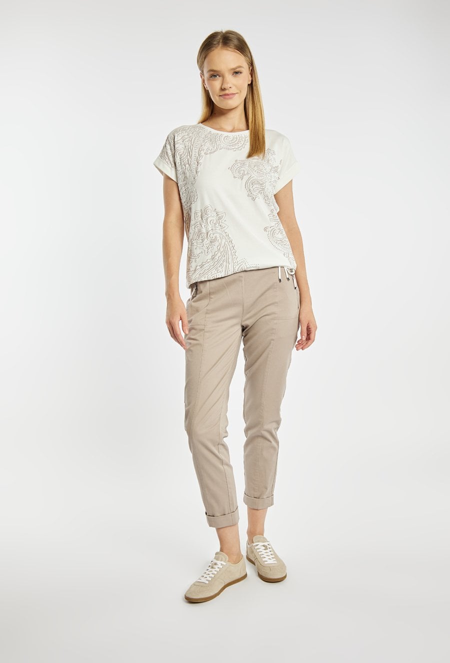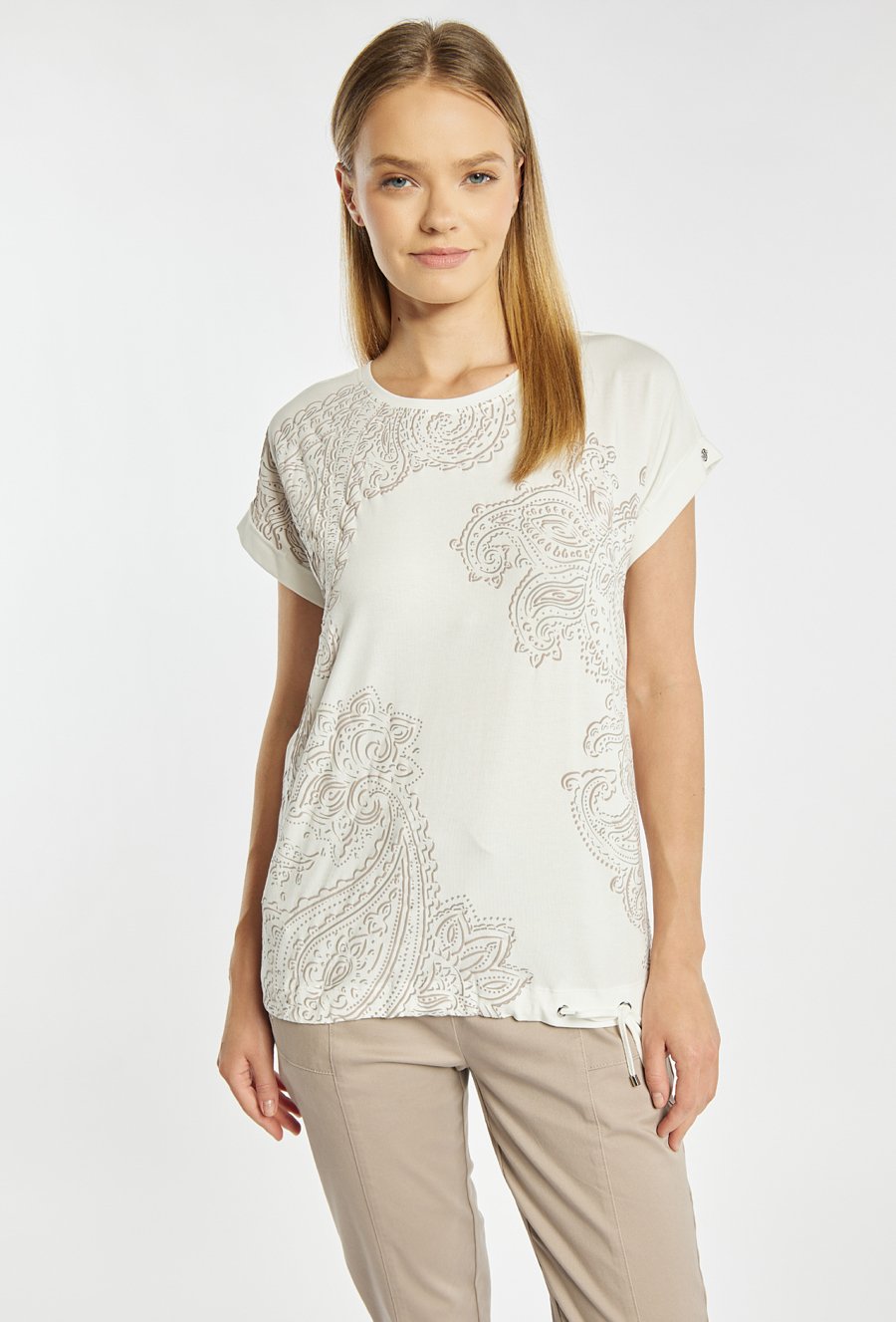 T-shirt damski o swobodnym kroju z efektownym, paisley wzorem na całej powierzchni. Model z krótkim, podwiniętym rękawem oraz klasycznym, okrągłym dekoltem. Model ten na dole ma również ściągacz z wiązaniem. T-shirt świetnie sprawdzi się w codziennych stylizacjach.
