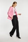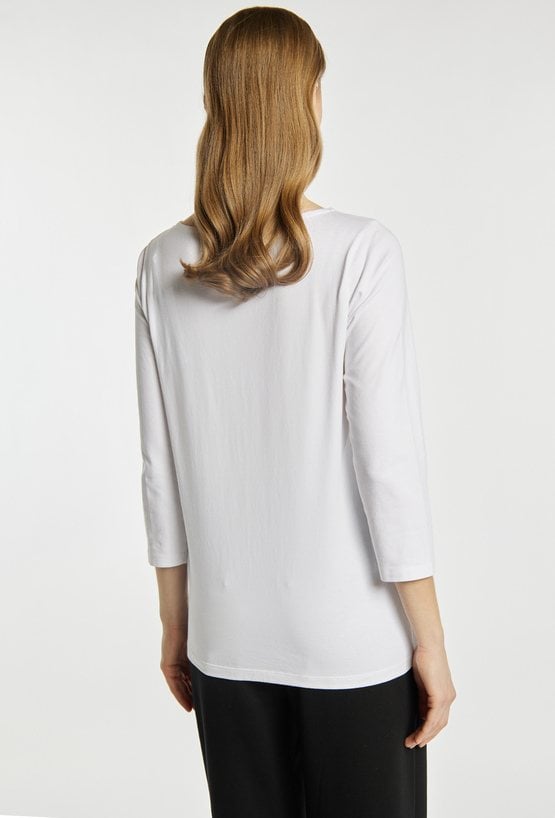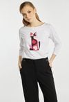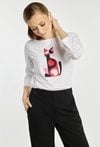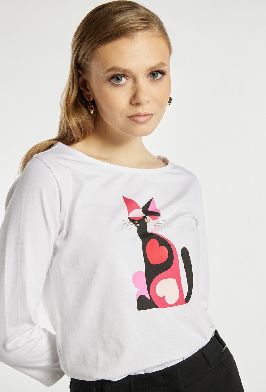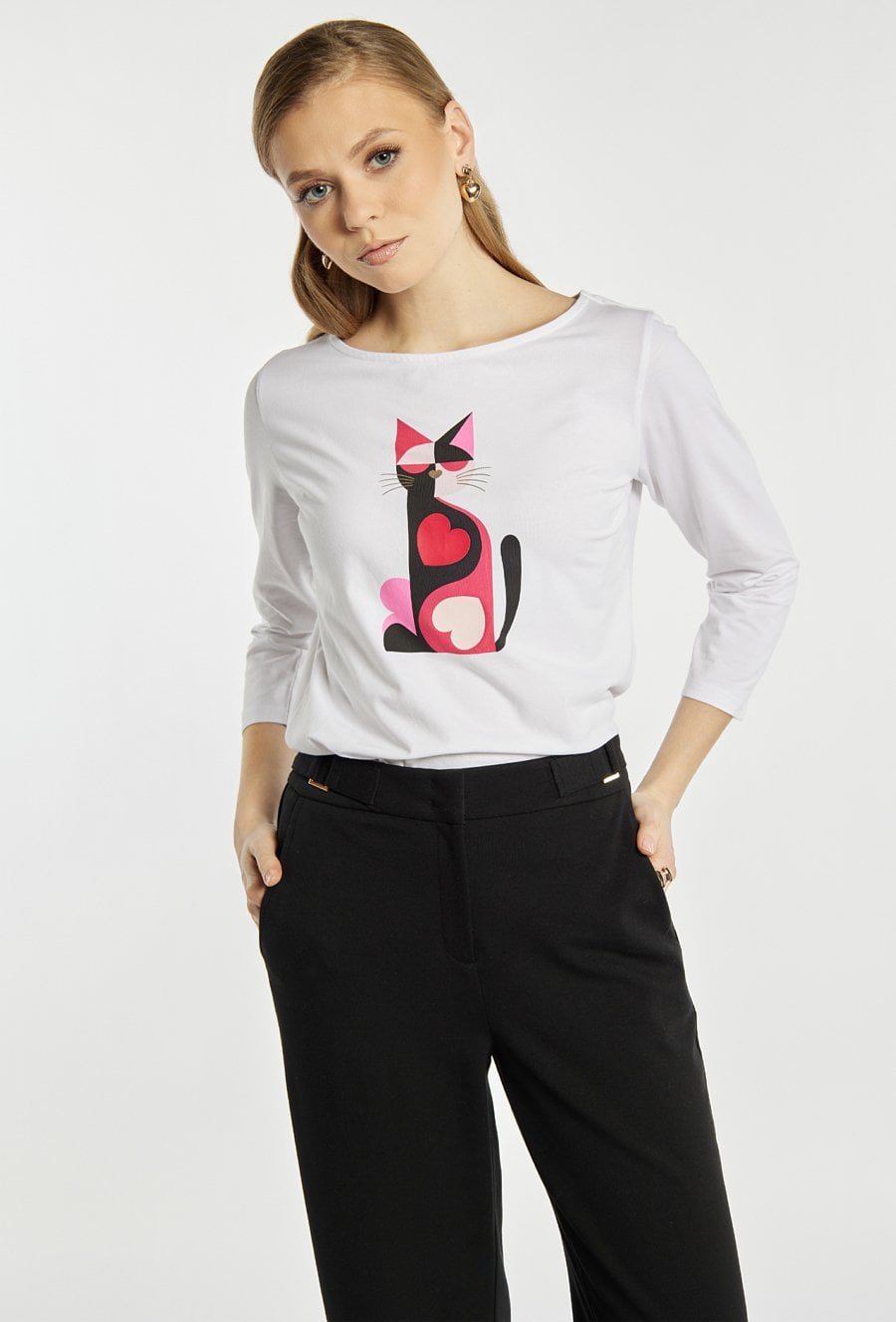 T-shirt z rękawem 3/4 i półokrągłym dekoltem wyróżnia się kolorowym nadrukiem z motywem kota w sercach, który dodaje stylizacji lekkości i zabawnego charakteru. Model idealny na co dzień, zwłaszcza jako element walentynkowych zestawów. Modelka na zdjęciu ma 177 cm wzrostu i prezentuje rozmiar S.