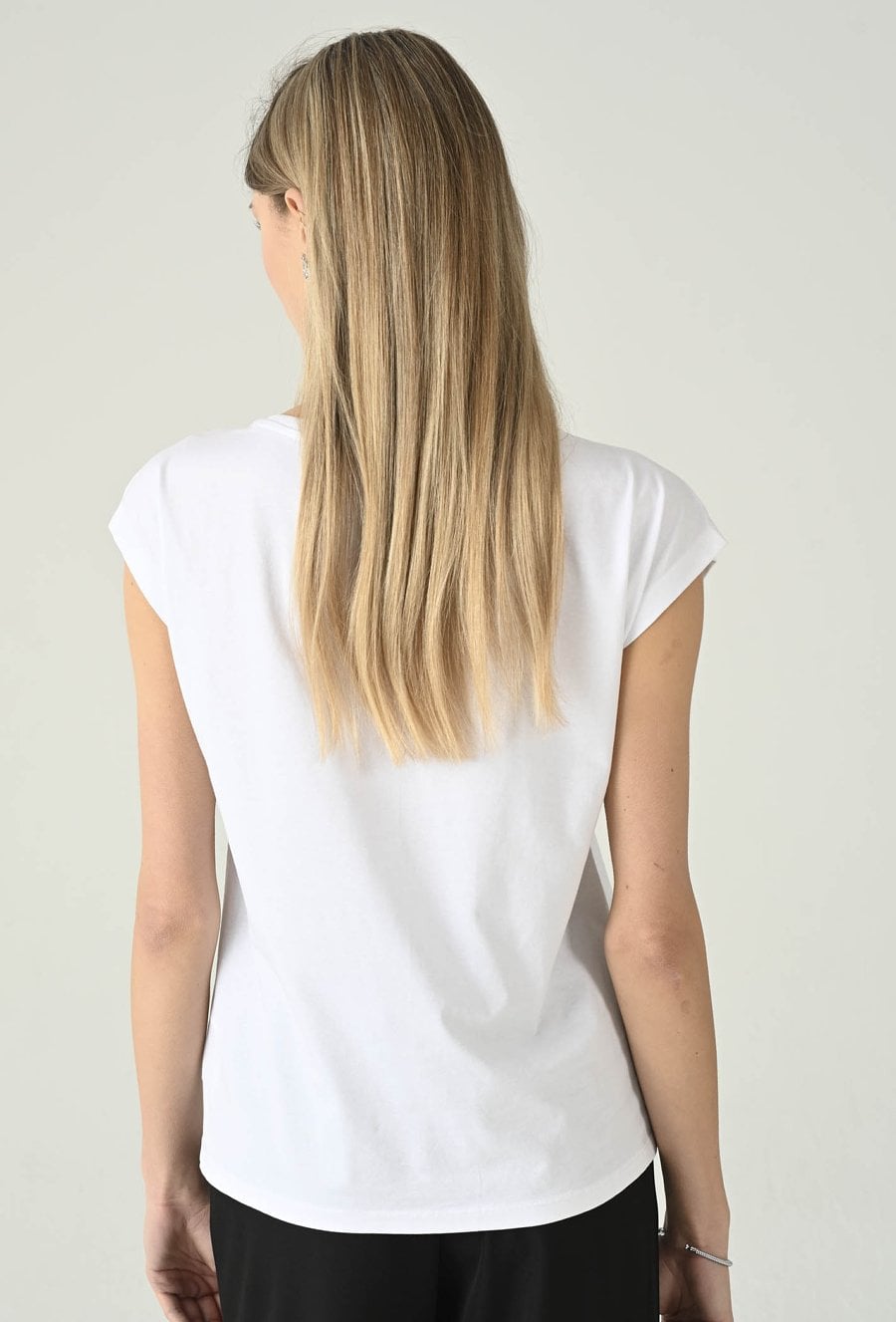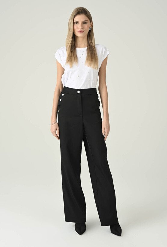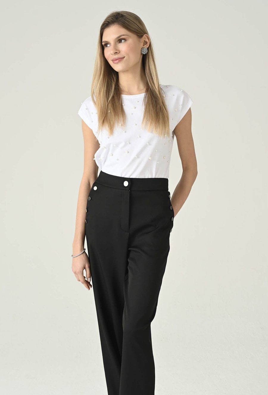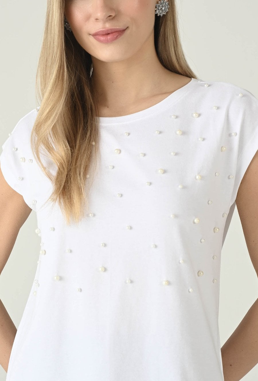 T-shirt damski o prostym, uniwersalnym kroju. Model z krótkim rękawem i klasycznym, okrągłym dekoltem. Przód zdobią drobne, metaliczne aplikacje rozmieszczone na całej powierzchni, które nadają całości nowoczesnego i eleganckiego charakteru. T-shirt damski z ozdobnymi detalami świetnie sprawdzi się w codziennych stylizacjach, a także w bardziej dopracowanych zestawach. Modelka na zdjęciu ma 177 cm wzrostu i prezentuje rozmiar S.