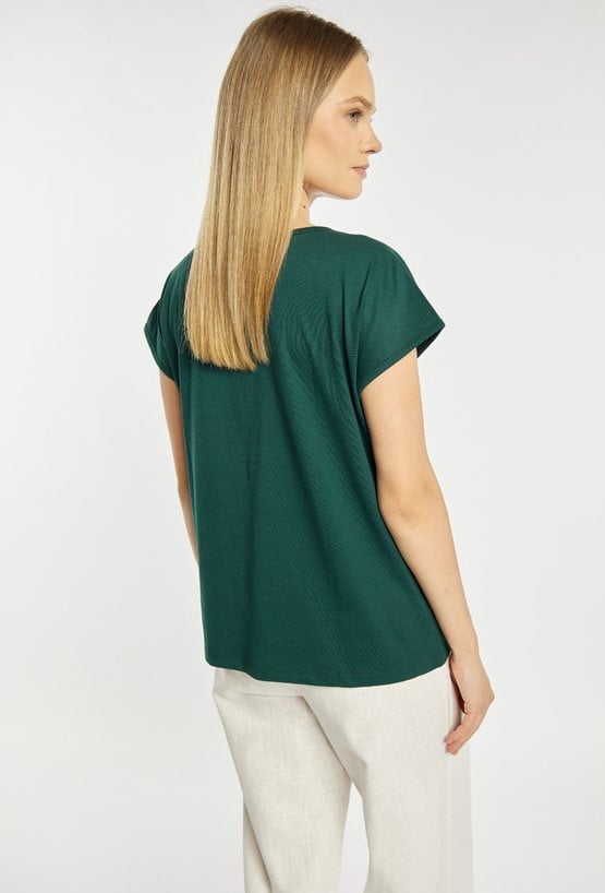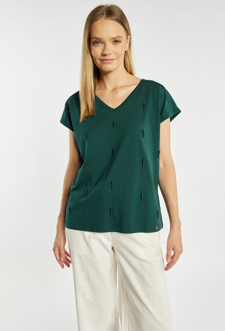 T-shirt damski o luźnym, komfortowym kroju z krótkim rękawem. Model z dekoltem w kształcie litery V, który subtelnie podkreśla linię szyi. Całość zdobią delikatne, dekoracyjne aplikacje, nadające bluzce eleganckiego i oryginalnego charakteru. Modelka na zdjęciu ma 177 cm wzrostu i prezentuje rozmiar S.