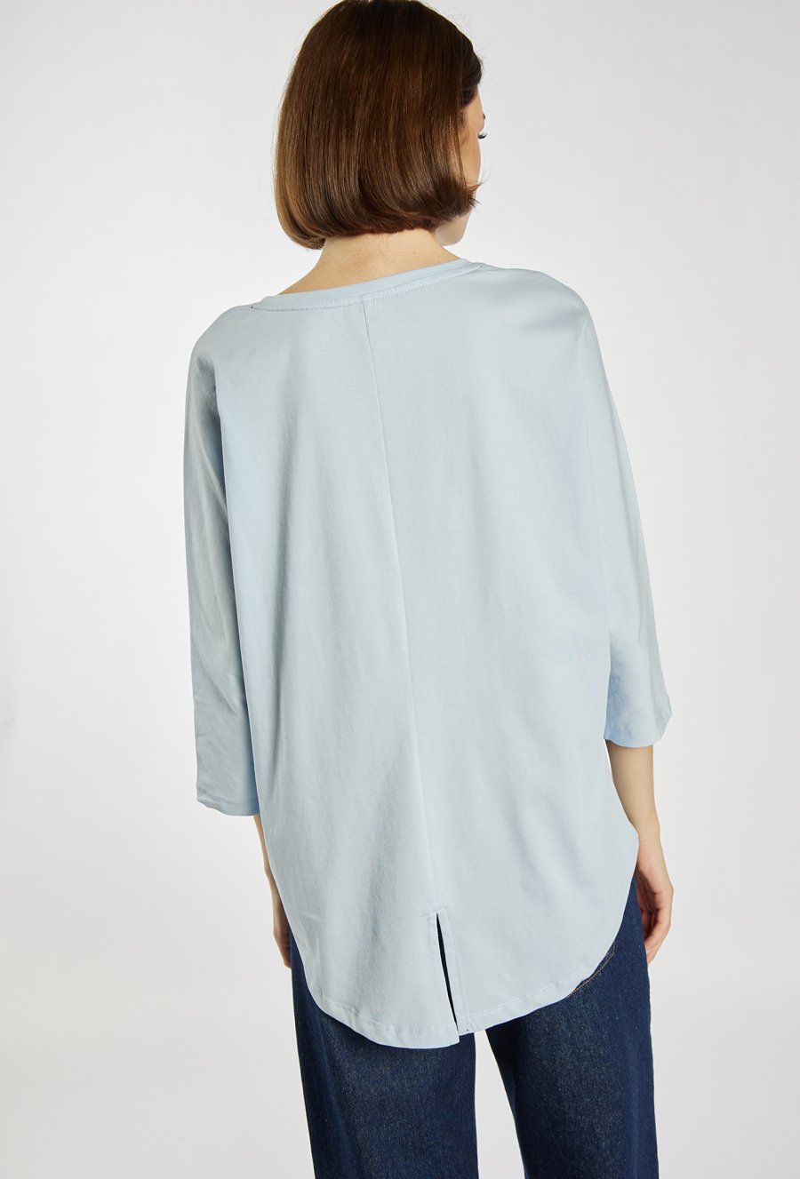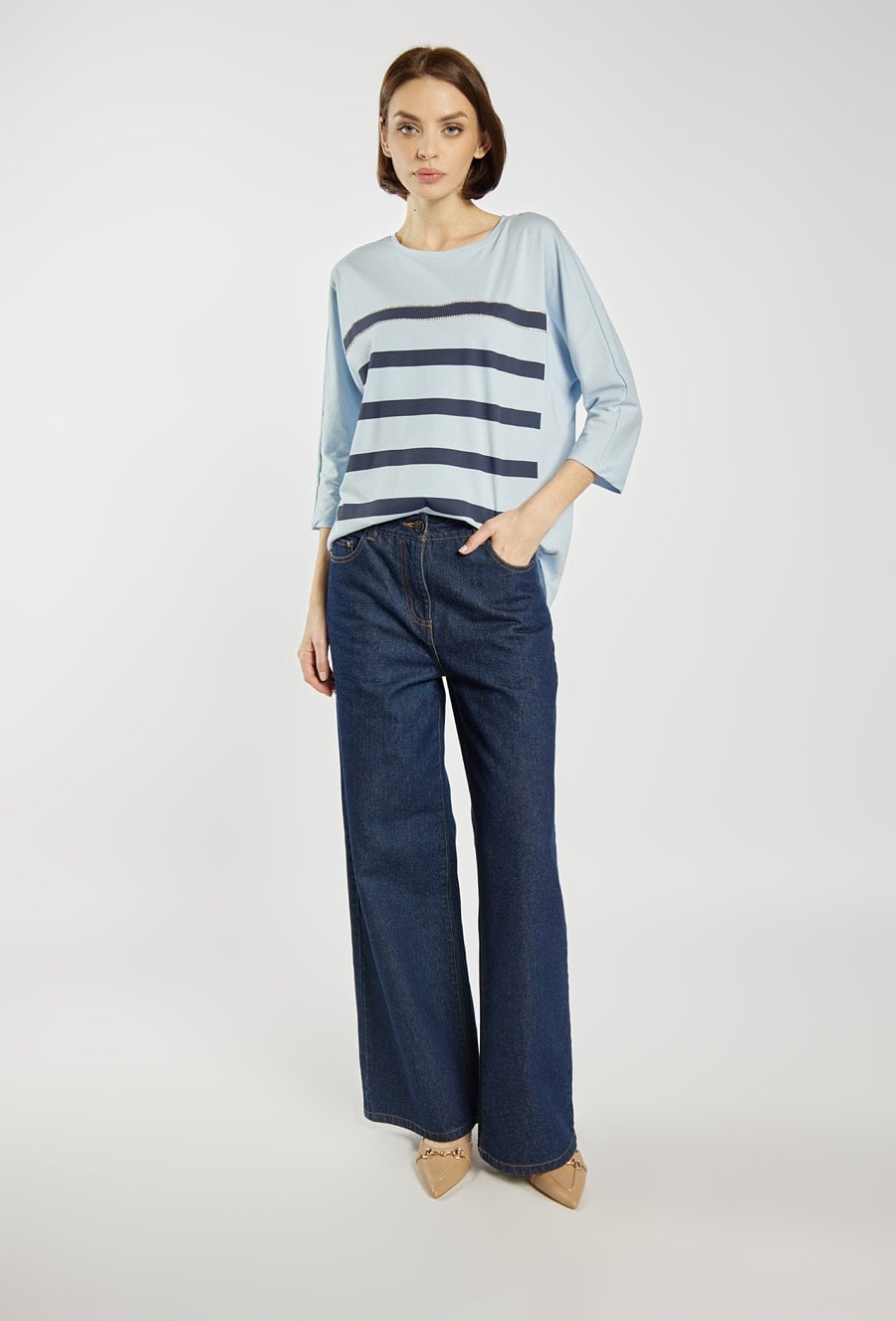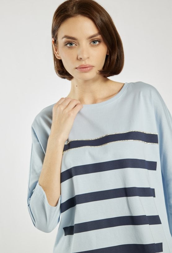 T-shirt z rękawem 3/4 i półokrągłym dekoltem wyróżnia się poziomymi paskami oraz subtelnym, dekoracyjnym akcentem na przodzie. Model świetnie sprawdzi się w codziennych, casualowych stylizacjach. Modelka na zdjęciu ma 177 cm wzrostu i prezentuje rozmiar S.