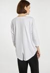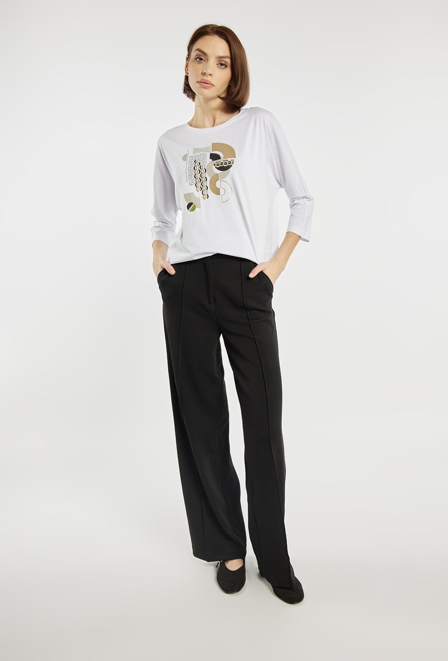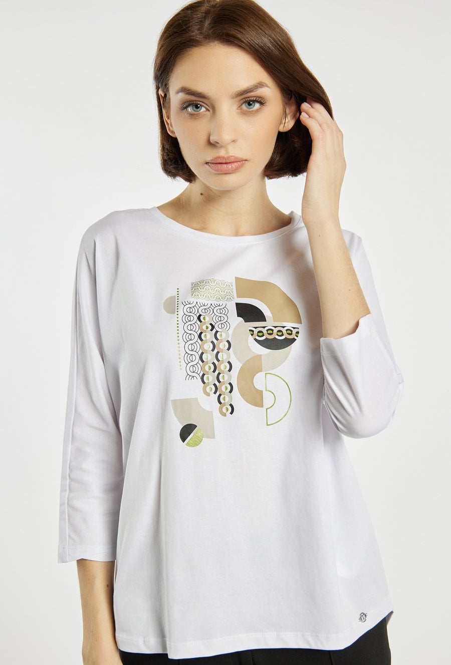 T-shirt o swobodnym, prostym kroju z długim rękawem. T-shirt wyróżnia się nowoczesnym, geometrycznym nadrukiem w stonowanej kolorystyce, który nadaje całości oryginalnego charakteru. T-shirt dobrze układa się na sylwetce i sprawdzi się w codziennych stylizacjach. Modelka na zdjęciu ma 177 cm wzrostu i prezentuje rozmiar S.