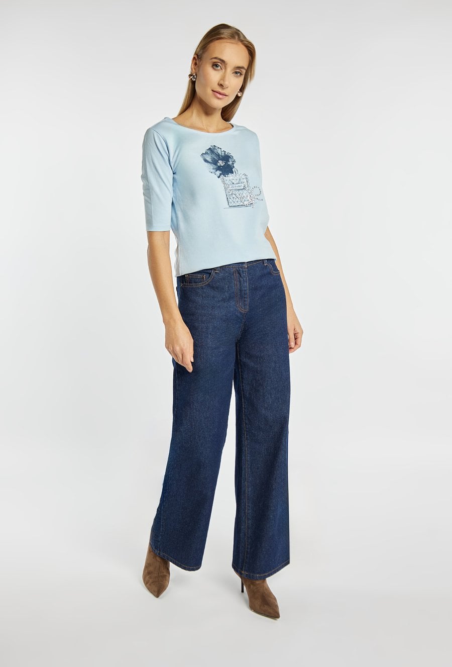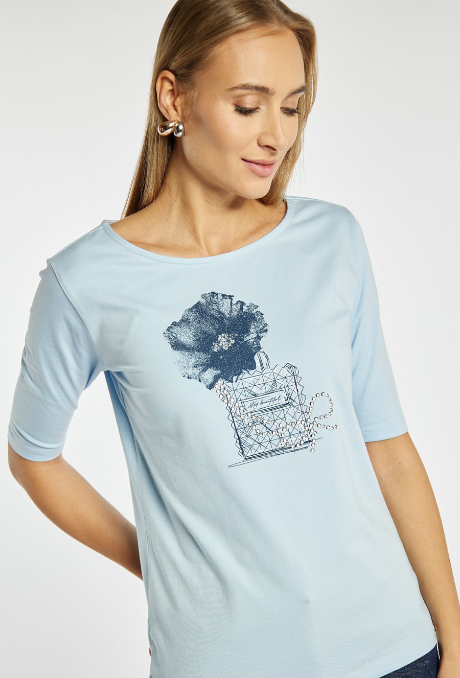 T-shirt z subtelnym nadrukiem to lekka i kobieca propozycja idealna na wiosenne dni. Delikatny motyw graficzny nadaje mu świeżości, a półdługie rękawy zapewniają komfort noszenia. Świetnie sprawdzi się w codziennych stylizacjach – z jeansami, spódnicą czy lekkim kardiganem. Modelka na zdjęciu ma 177 cm wzrostu i prezentuje rozmiar S.