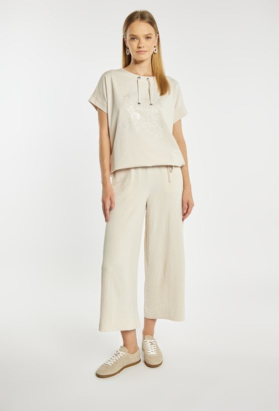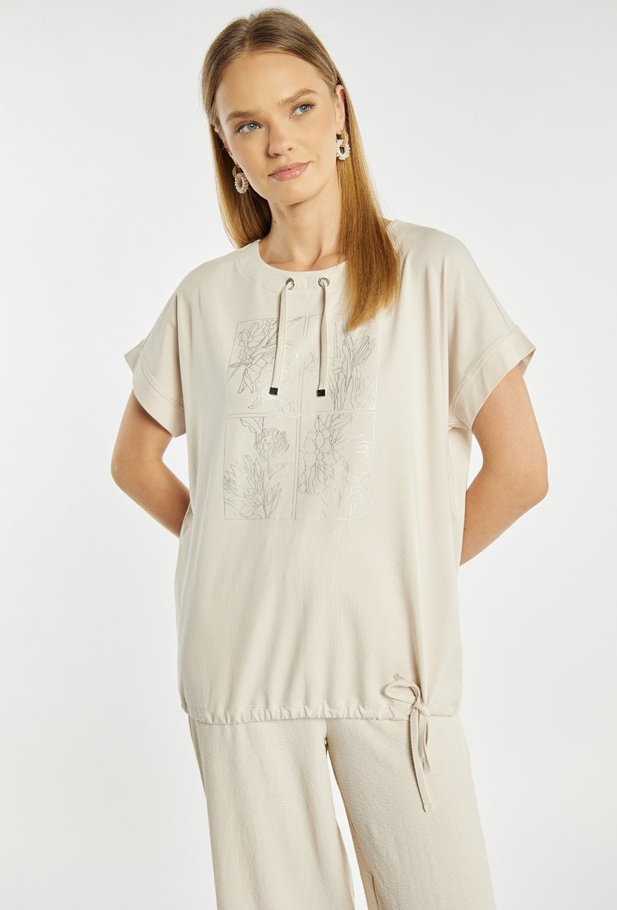 T-shirt damski o luźnym, komfortowym kroju z krótkim rękawem. Model z okrągłym dekoltem oraz ozdobnymi troczkami przy szyi, które nadają całości nowoczesnego charakteru. Subtelny nadruk z przodu dodaje delikatnego, stylowego akcentu. Modelka na zdjęciu ma 177 wzrostu i prezentuje rozmiar S.