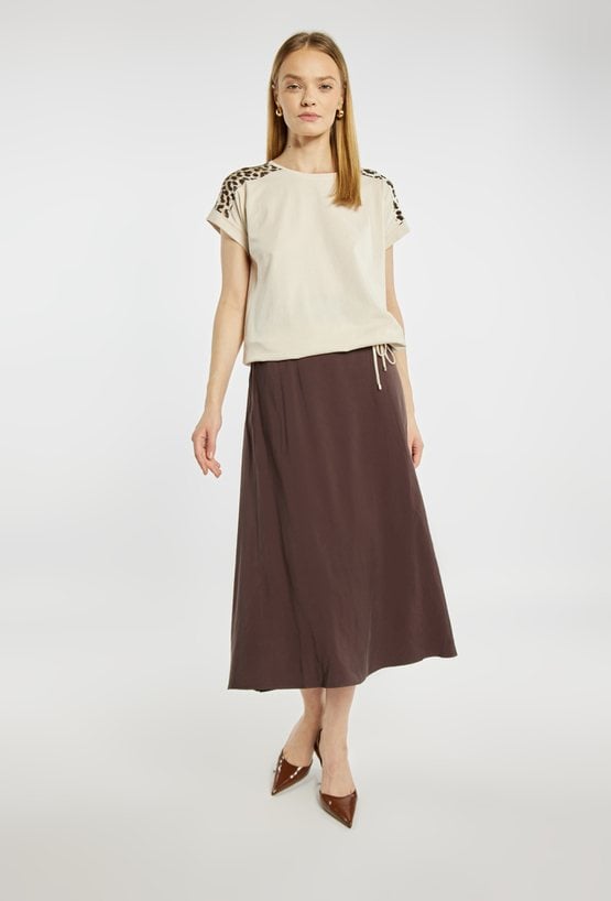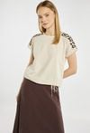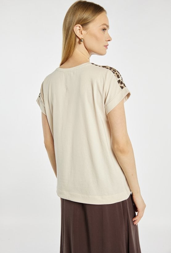 T-shirt damski o swobodnym fasonie. Kontrastowe wstawki w zwierzęcy wzór przy ramionach nadają całości modnego charakteru. T-shirt z okrągłym dekoltem oraz krótkimi rękawami. U dołu znajduje się regulowane wiązanie, które pozwala dopasować fason do sylwetki. Idealny do codziennych stylizacji z jeansami lub spodniami materiałowymi. Modelka na zdjęciu ma 177 cm wzrostu i prezentuje rozmiar S.