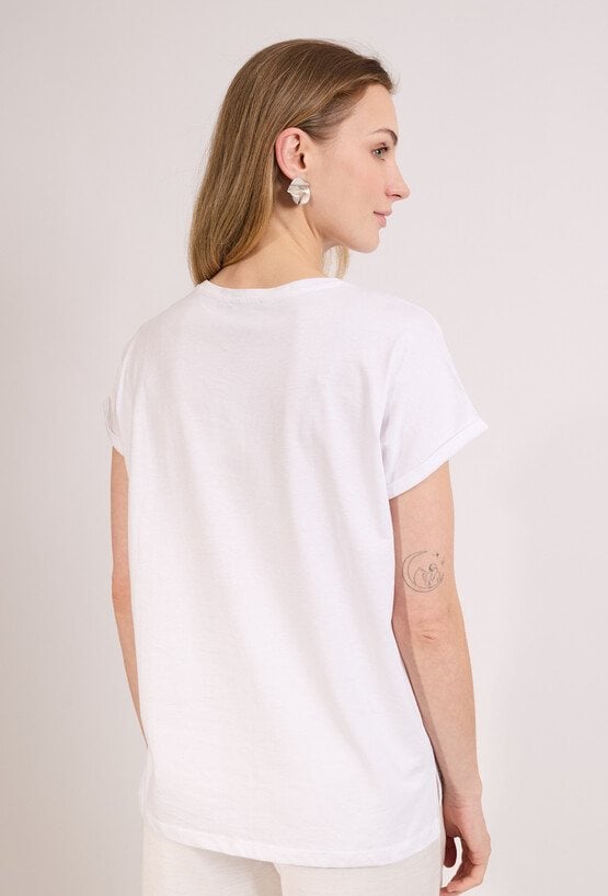 T-shirt damski o luźnym kroju z krótkim rękawem. Model z okrągłym dekoltem oraz subtelnym napisem z przodu, który nadaje całości nowoczesnego charakteru. T-shirt doskonale sprawdzi się w codziennych i casualowych stylizacjach, zapewniając komfort i wygodę noszenia. Modelka na zdjęciu ma 177 cm wzrostu i prezentuje rozmiar S.
