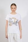 T-shirt damski o swobodnym, komfortowym kroju. Model z krótkim rękawem oraz klasycznym, zaokrąglonym dekoltem. Przód zdobi efektowny nadruk z motywem paryskiej uliczki oraz napisem „Café de Paris”, wzbogacony złotymi detalami, które nadają koszulce eleganckiego charakteru. Modelka na zdjęciu ma 177 cm wzrostu i prezentuje rozmiar S.
