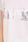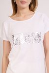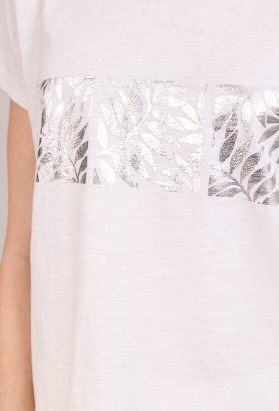 T-shirt damski o luźnym kroju z krótkim rękawem. Model z okrągłym dekoltem oraz subtelnym, połyskującym nadrukiem z przodu, który nadaje całości eleganckiego charakteru. T-shirt doskonale sprawdzi się w codziennych i casualowych stylizacjach, zapewniając komfort i wygodę noszenia. Modelka na zdjęciu ma 177 cm wzrostu i prezentuje rozmiar S.