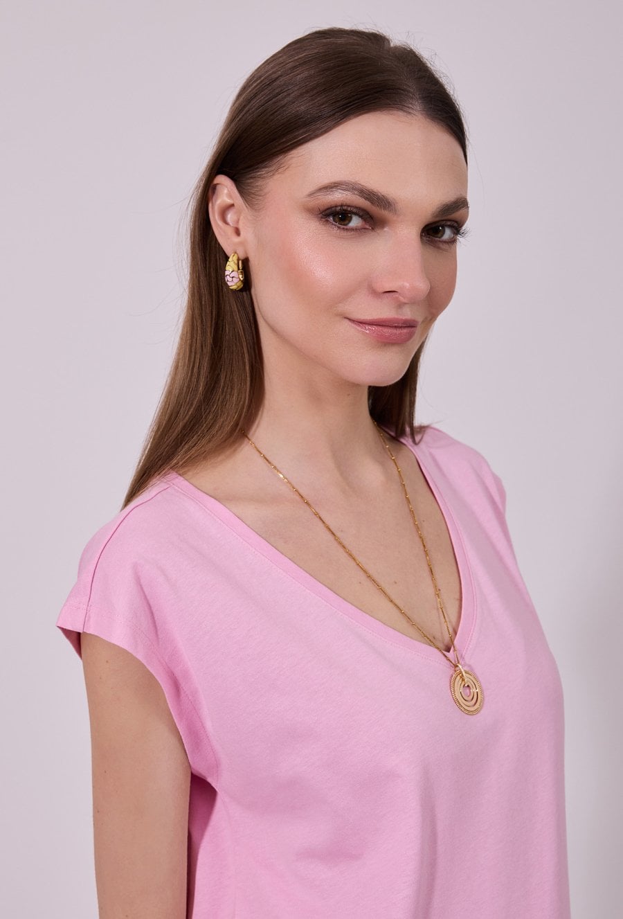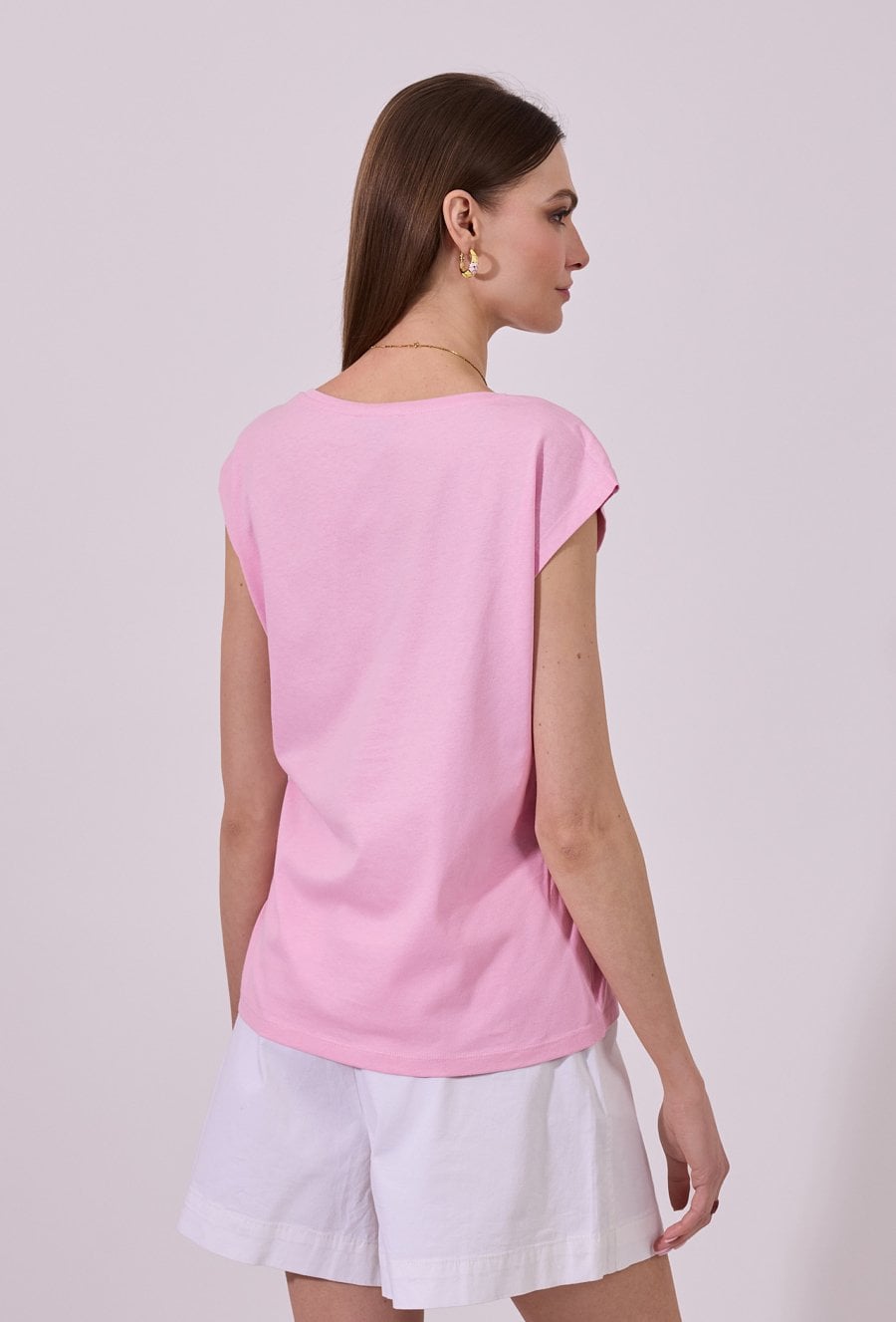 T-shirt damski o prostym, klasycznym kroju bez rękawów. Model z dekoltem w kształcie litery V, który subtelnie podkreśla linię szyi i dodaje całości lekkości. Minimalistyczny fason sprawia, że doskonale sprawdzi się jako baza wielu stylizacji- zarówno casualowych, jak i bardziej eleganckich. Modelka na zdjęciu ma 177 cm wzrostu i prezentuje rozmiar S.
