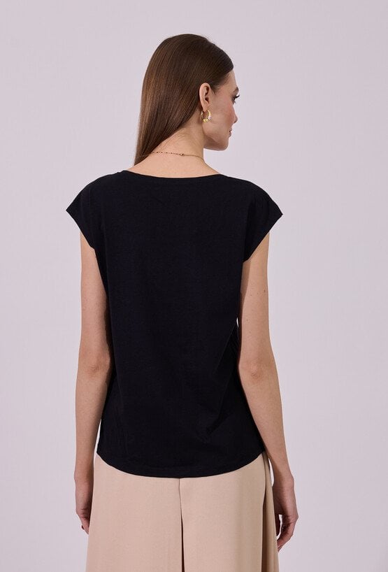 T-shirt damski o prostym, klasycznym kroju bez rękawów. Model z dekoltem w kształcie litery V, który subtelnie podkreśla linię szyi i dodaje całości lekkości. Minimalistyczny fason sprawia, że doskonale sprawdzi się jako baza wielu stylizacji- zarówno casualowych, jak i bardziej eleganckich. Modelka na zdjęciu ma 177 cm wzrostu i prezentuje rozmiar S.