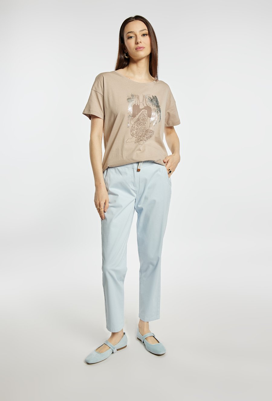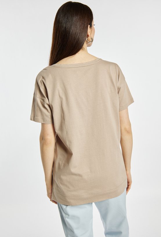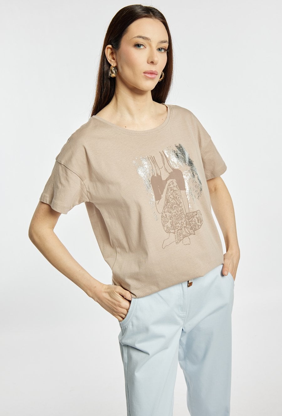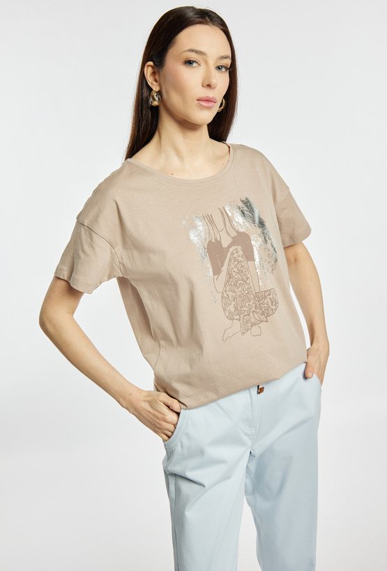 T-shirt damski o luźnym, komfortowym kroju. Model z krótkim rękawem i klasycznym, okrągłym dekoltem, ozdobiony subtelnym nadrukiem z delikatnym połyskiem, który dodaje całości nowoczesnego charakteru. T-shirt dobrze układa się na sylwetce i świetnie sprawdzi się w codziennych stylizacjach- zarówno w zestawieniu z jeansami, jak i lekkimi spodniami materiałowymi. Modelka na zdjęciu ma 177 cm wzrostu i prezentuje rozmiar S.