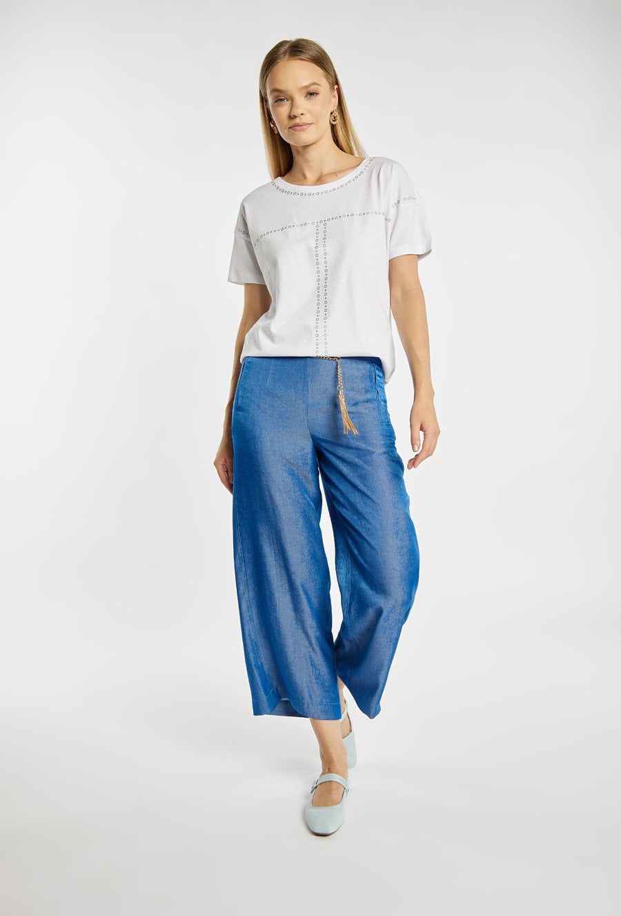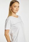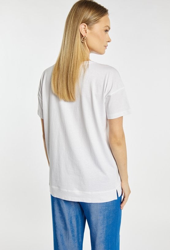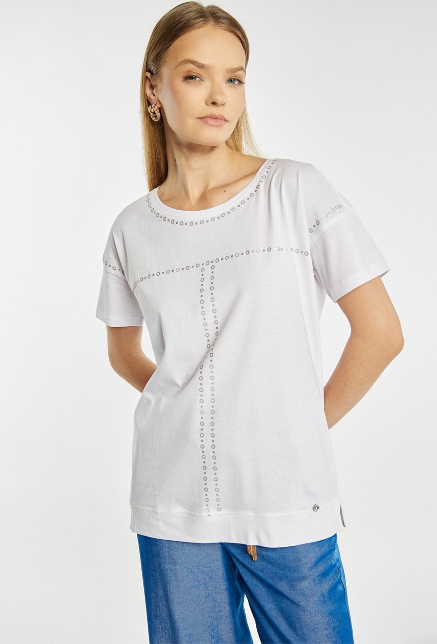 T-shirt damski o swobodnym, prostym kroju. Model z krótkim rękawem i okrągłym dekoltem, ozdobiony subtelnym, geometrycznym zdobieniem. T-shirt świetnie sprawdzi się w codziennych stylizacjach. Modelka na zdjęciu ma 177 cm wzrostu i prezentuje rozmiar S.