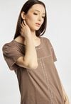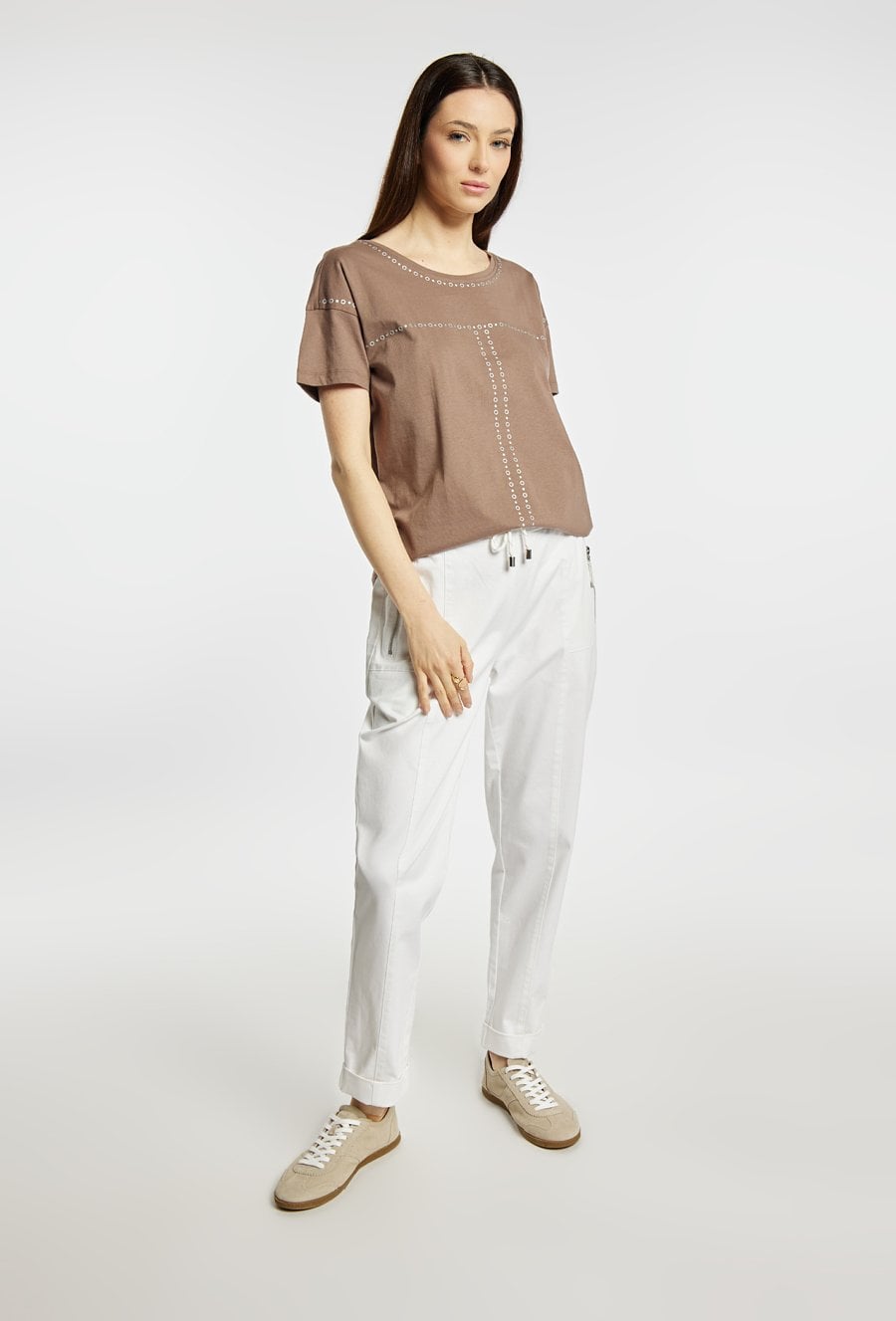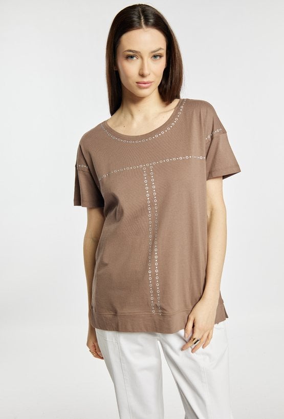T-shirt damski o swobodnym, prostym kroju. Model z krótkim rękawem i okrągłym dekoltem, ozdobiony subtelnym, geometrycznym zdobieniem. T-shirt świetnie sprawdzi się w codziennych stylizacjach. Modelka na zdjęciu ma 177 cm wzrostu i prezentuje rozmiar S.
