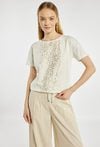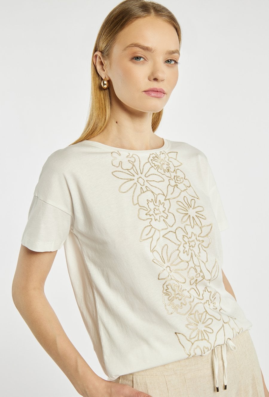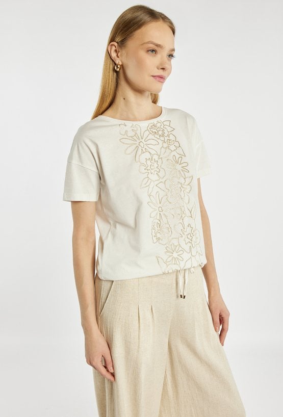 T-shirt damski o luźnym, swobodnym fasonie. Model z okrągłym dekoltem oraz krótkimi rękawami. Z przodu ozdobiony dekoracyjnym, kwiatowym motywem w kontrastowym kolorze, który nadaje całości kobiecego i subtelnie eleganckiego charakteru. Idealny do codziennych stylizacji. Modelka na zdjęciu ma 177 cm wzrostu i prezentuje rozmiar S.