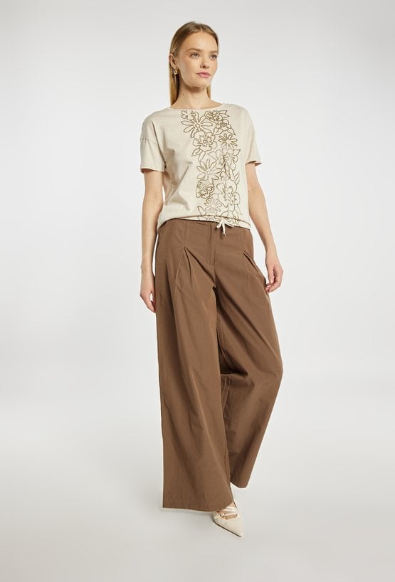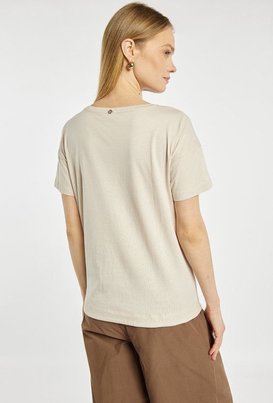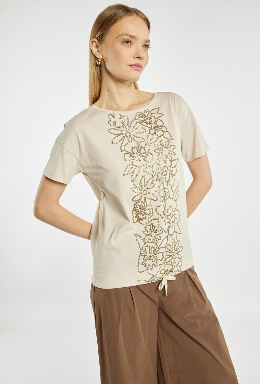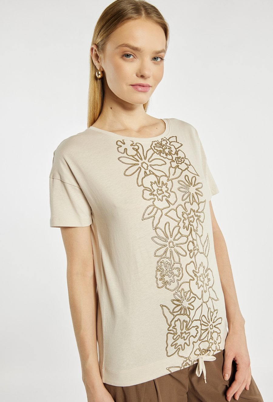 T-shirt damski o luźnym, swobodnym fasonie. Model z okrągłym dekoltem oraz krótkimi rękawami. Z przodu ozdobiony dekoracyjnym, kwiatowym motywem w kontrastowym kolorze, który nadaje całości kobiecego i subtelnie eleganckiego charakteru. Idealny do codziennych stylizacji. Modelka na zdjęciu ma 177 cm wzrostu i prezentuje rozmiar S.