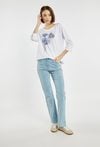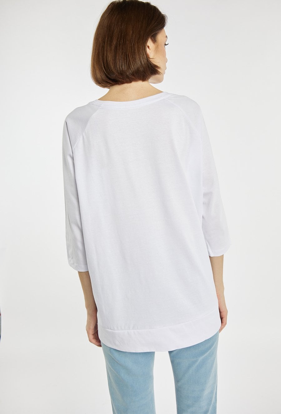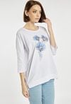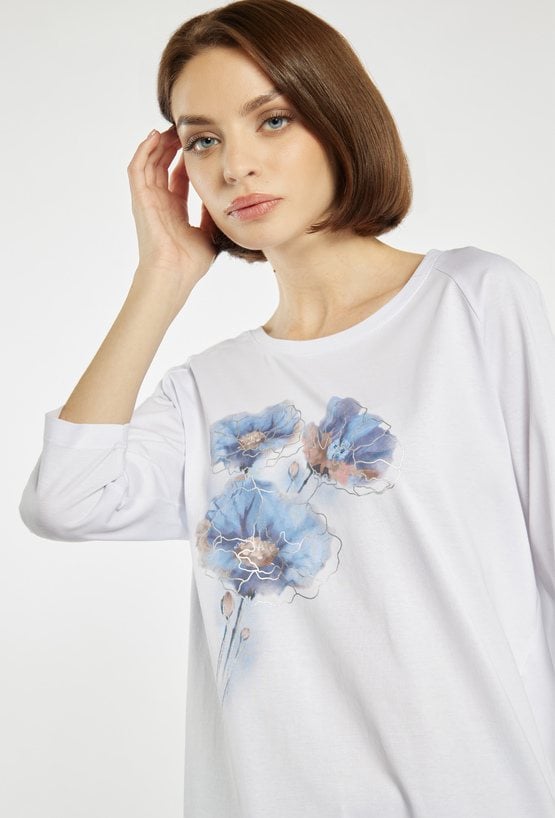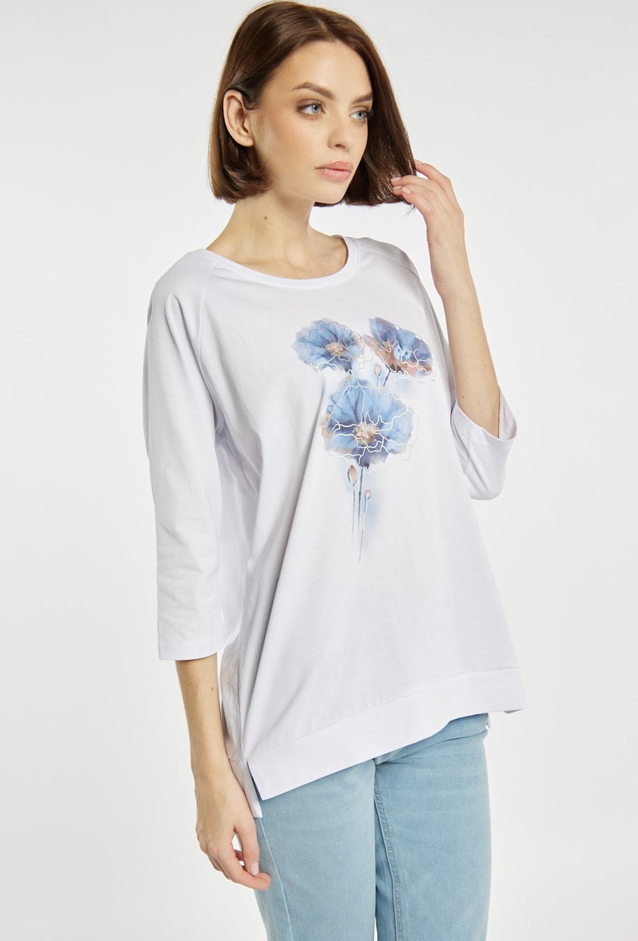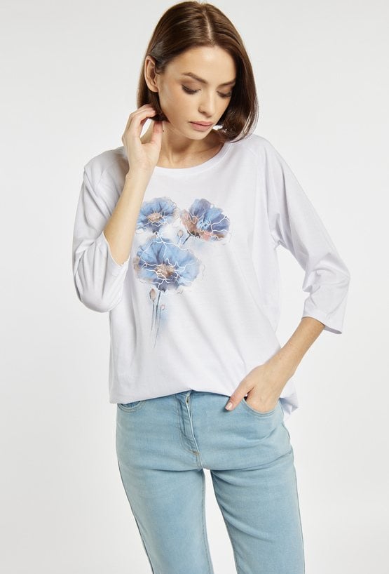 T-shirt o swobodnym, lekko wydłużonym kroju z rękawem 3/4. T-shirt wyróżnia się delikatnym, kwiatowym nadrukiem w odcieniach błękitu, który nadaje całości lekkości i wiosennego charakteru. Model ten sprawdzi się zarówno w codziennych stylizacjach z jeansami, jak i w bardziej casualowych zestawach. Modelka na zdjęciu ma 177 cm wzrostu i prezentuje rozmiar S.