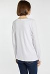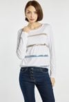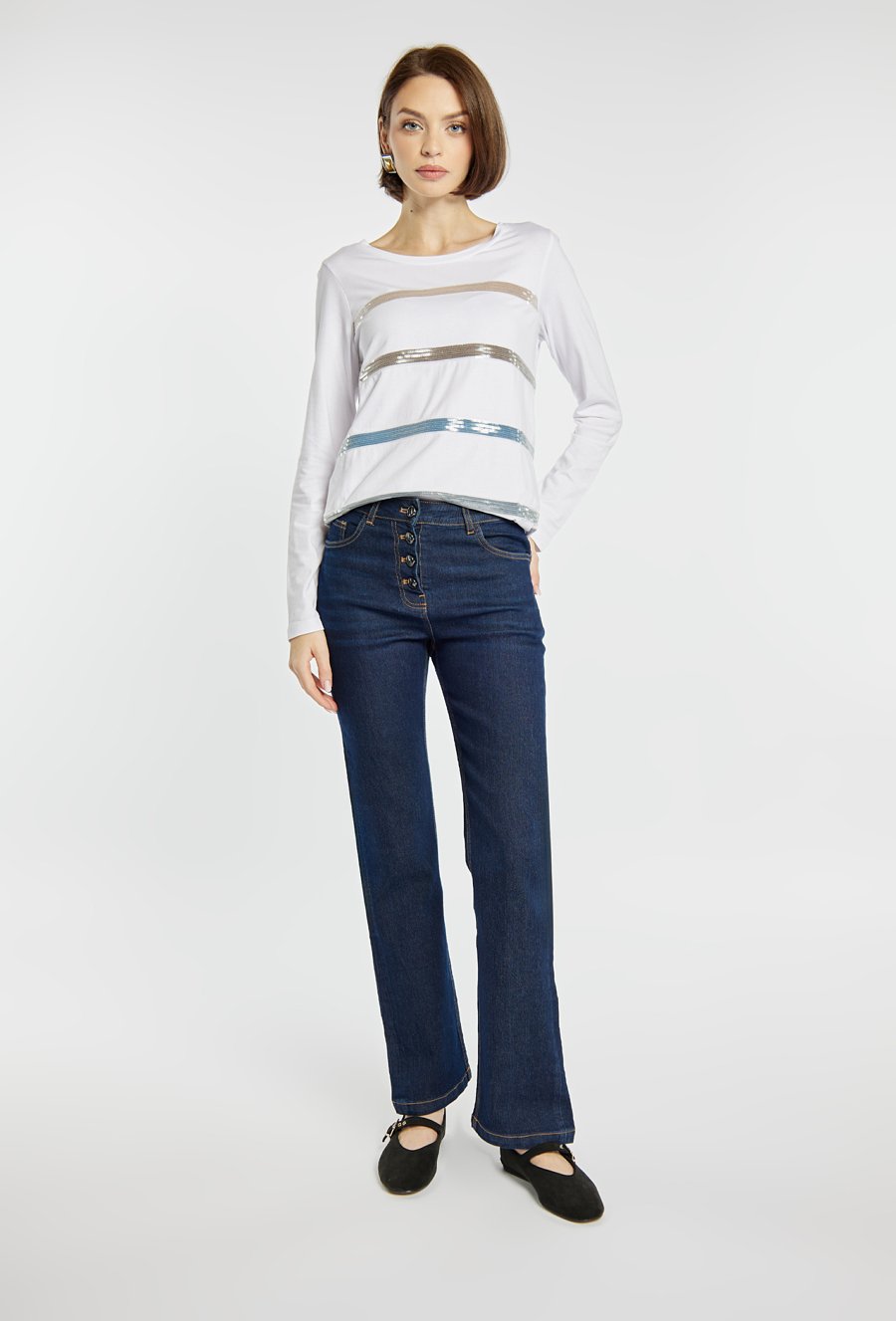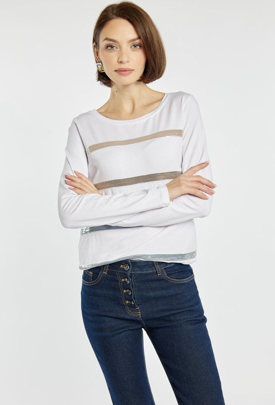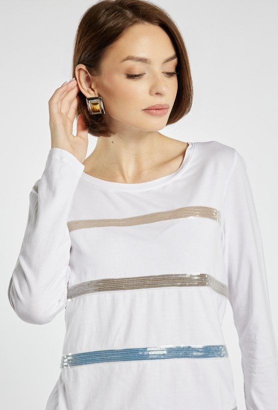 T-shirt z długim rękawem ozdobiony połyskującymi, poziomymi pasami z cekinów, które dodają mu nowoczesnego charakteru. Idealny wybór na co dzień, jak i na nieco bardziej eleganckie okazje. Modelka na zdjęciu ma 177 cm wzrostu i prezentuje rozmiar S.