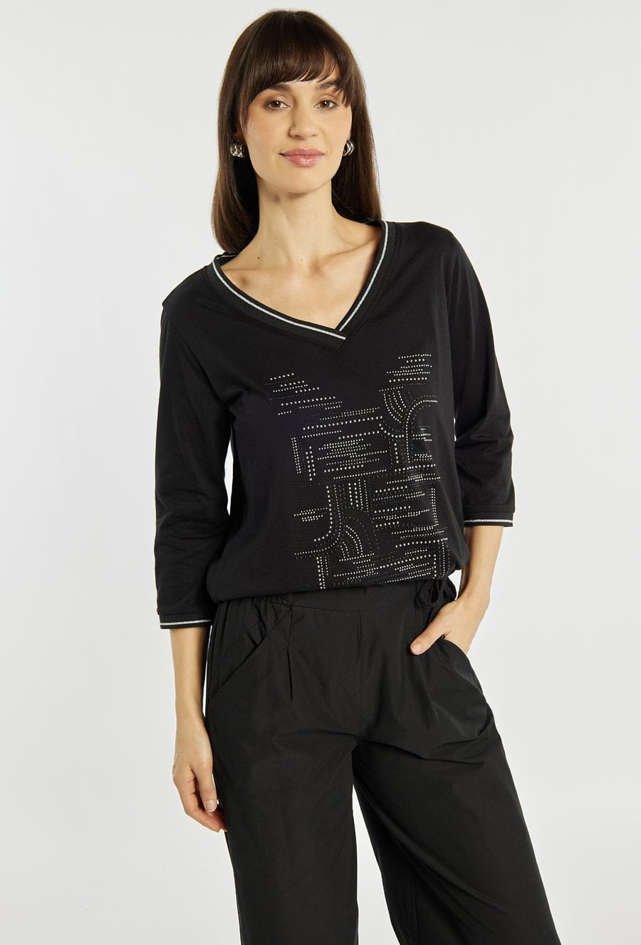 T-shirt o swobodnym, prostym kroju z dekoltem w kształcie litery V. T-shirt wyróżnia się ozdobnym nadrukiem z drobnymi, połyskującymi elementami, które dodają całości subtelnej elegancji oraz wiązaniem na dole. Model sprawdzi się zarówno w casualowych stylizacjach, jak i w zestawieniu z eleganckimi spodniami lub marynarką. Modelka na zdjęciu ma 177 cm wzrostu i prezentuje rozmiar S.