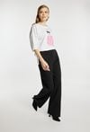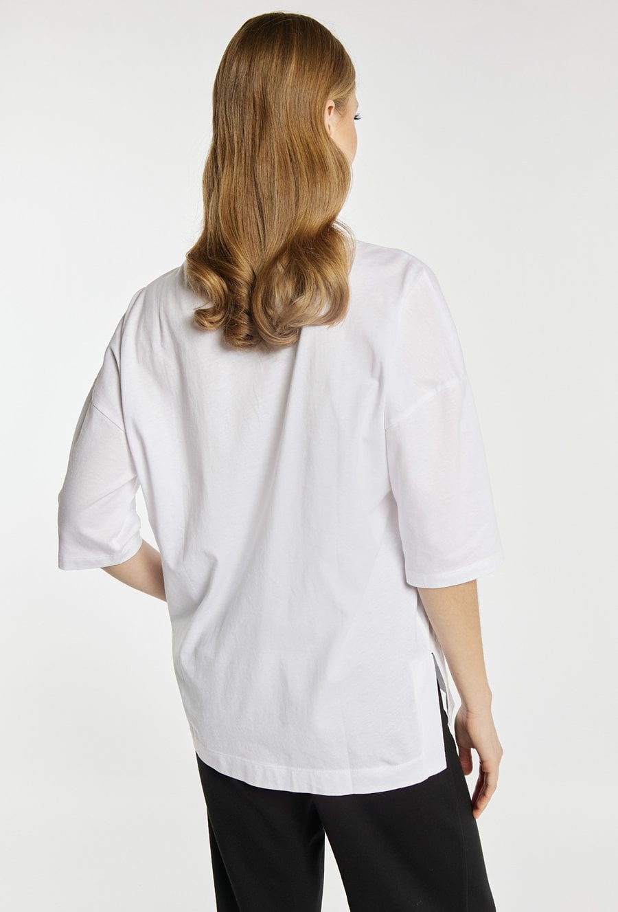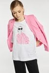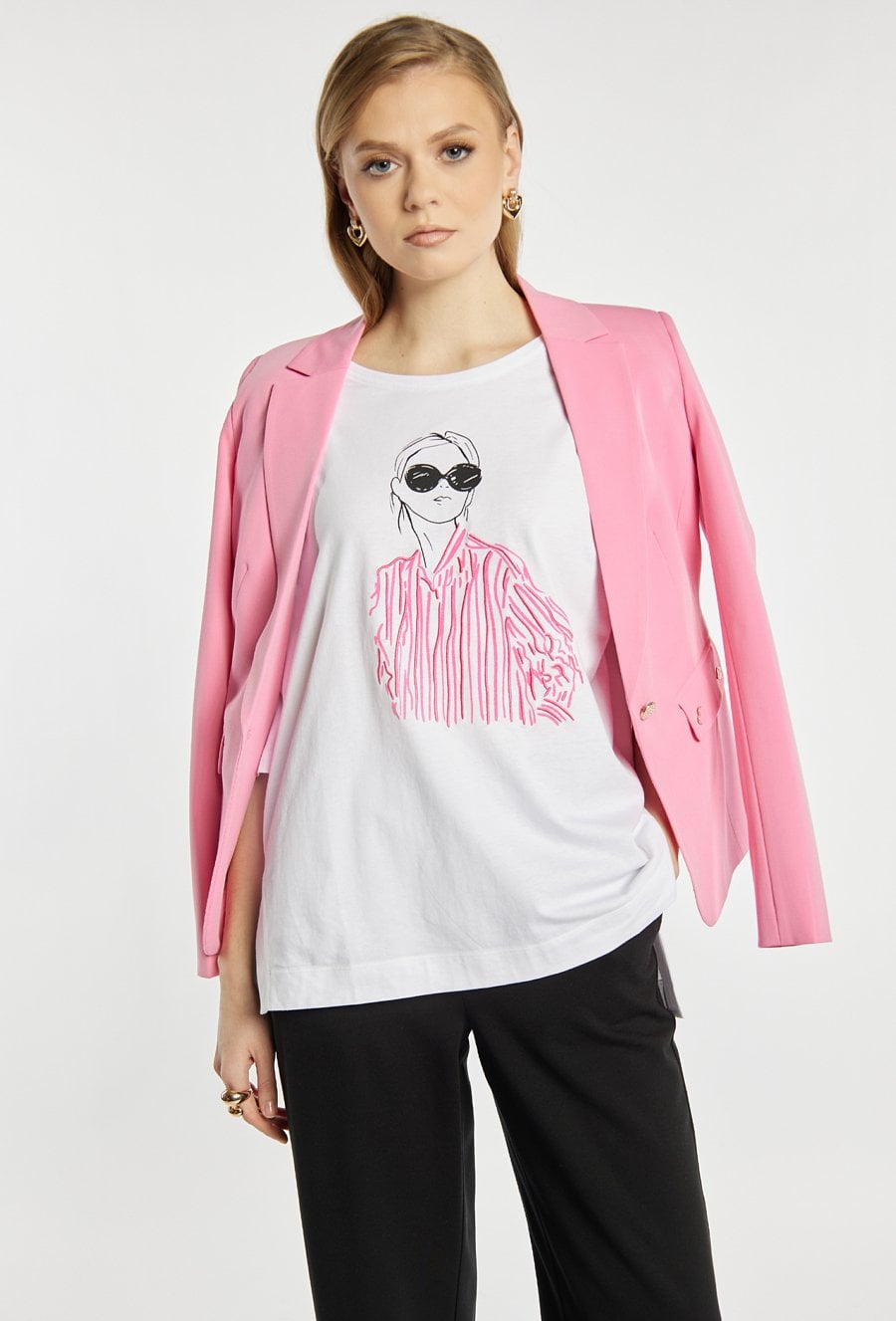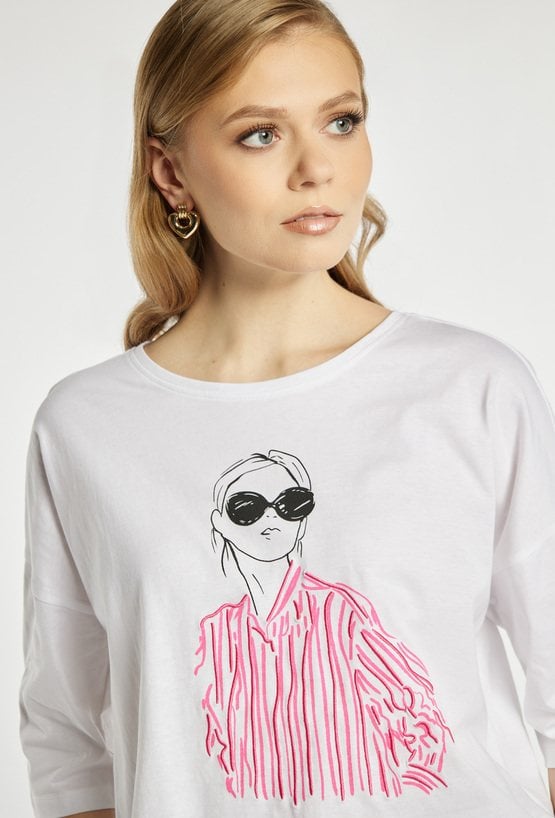 T-shirt damski wykonany z miękkiej, przyjemnej w dotyku bawełny. T-shirt o klasycznym kroju z krótkimi rękawami zdobi efektowny nadruk z kobiecą ilustracją, który dodaje stylizacji nowoczesnego charakteru. Model idealny na co dzień i do casualowych zestawów. Modelka na zdjęciu ma 177 cm wzrostu i prezentuje rozmiar S.
