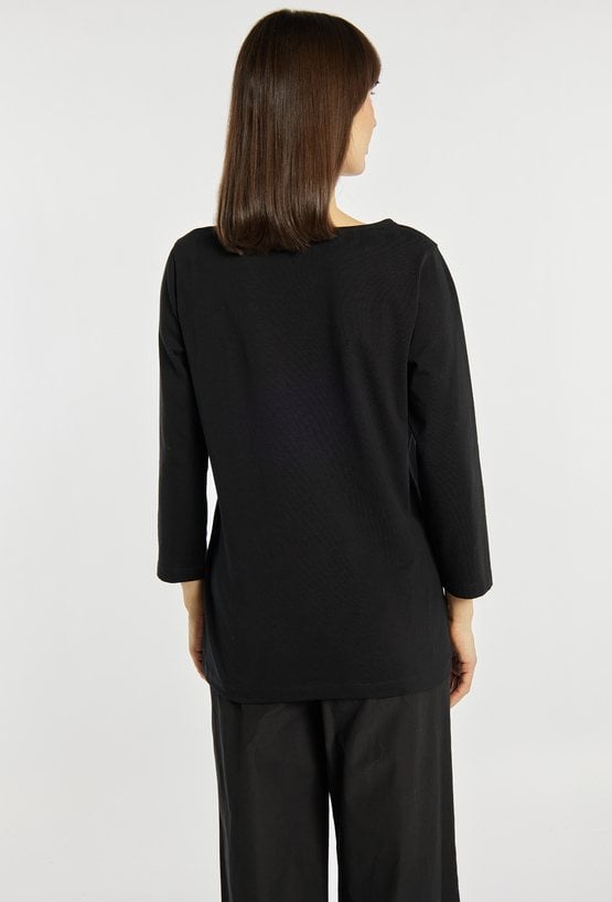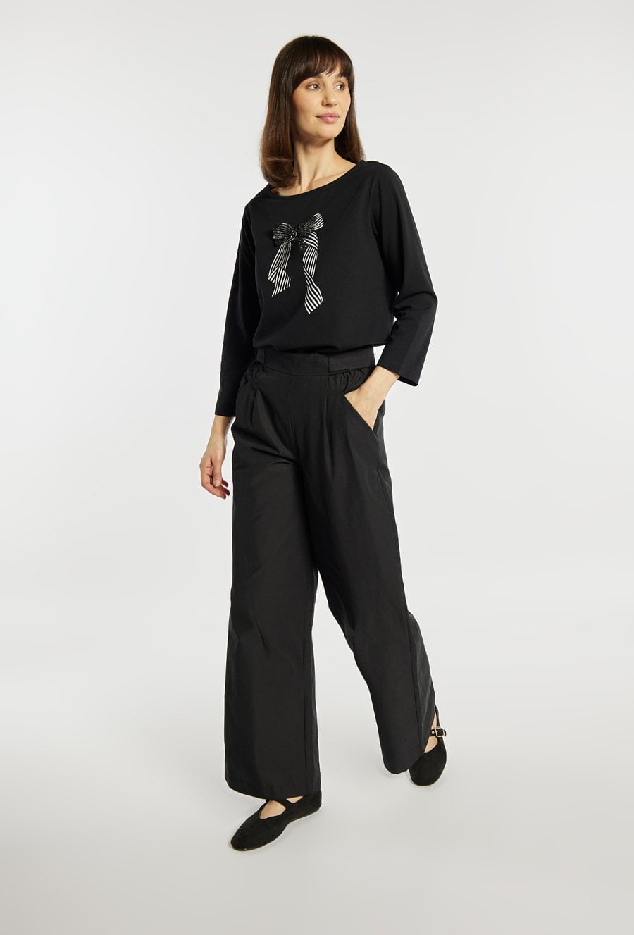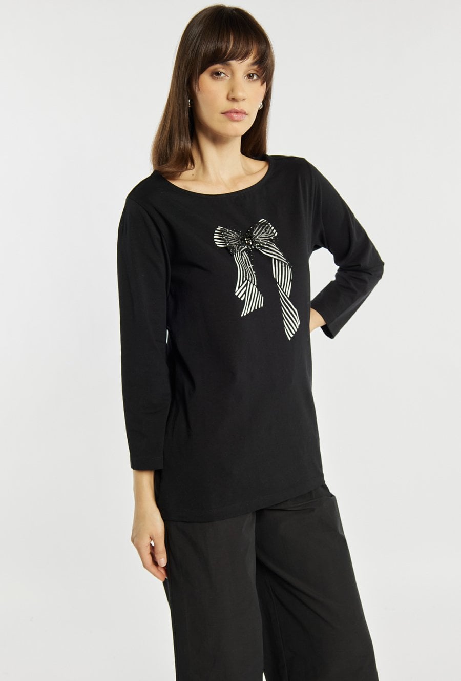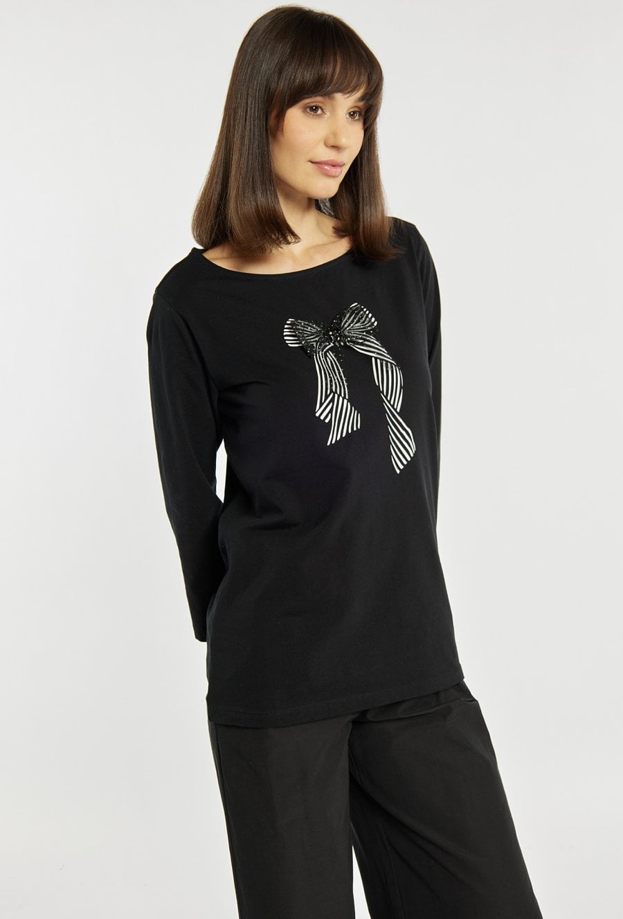 T-shirt o swobodnym, prostym kroju. T-shirt wyróżnia się efektowną aplikacją w formie kokardy z subtelnym połyskiem, która dodaje całości kobiecego charakteru. Model z długim rękawem i klasycznym, okrągłym dekoltem sprawdzi się zarówno w codziennych stylizacjach, jak i w zestawach bardziej eleganckich. Modelka na zdjęciu ma 177 cm wzrostu i prezentuje rozmiar S.