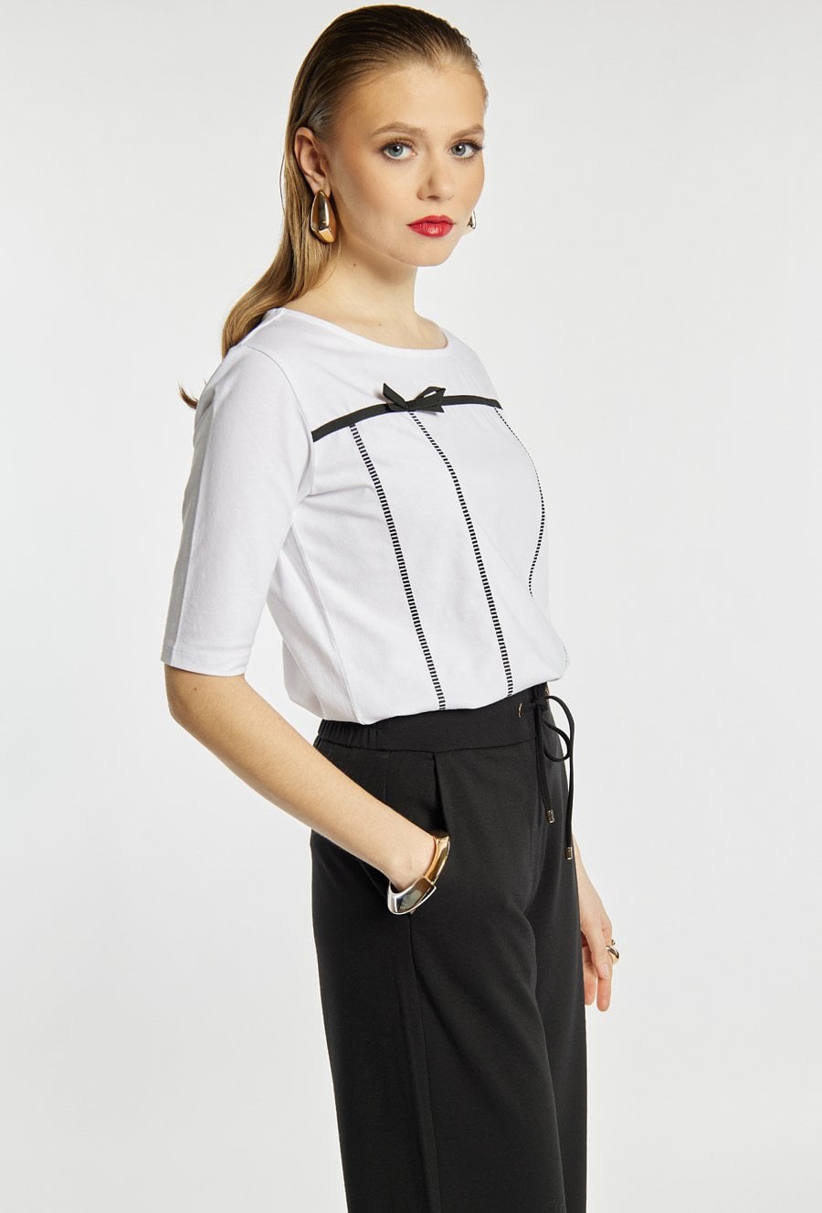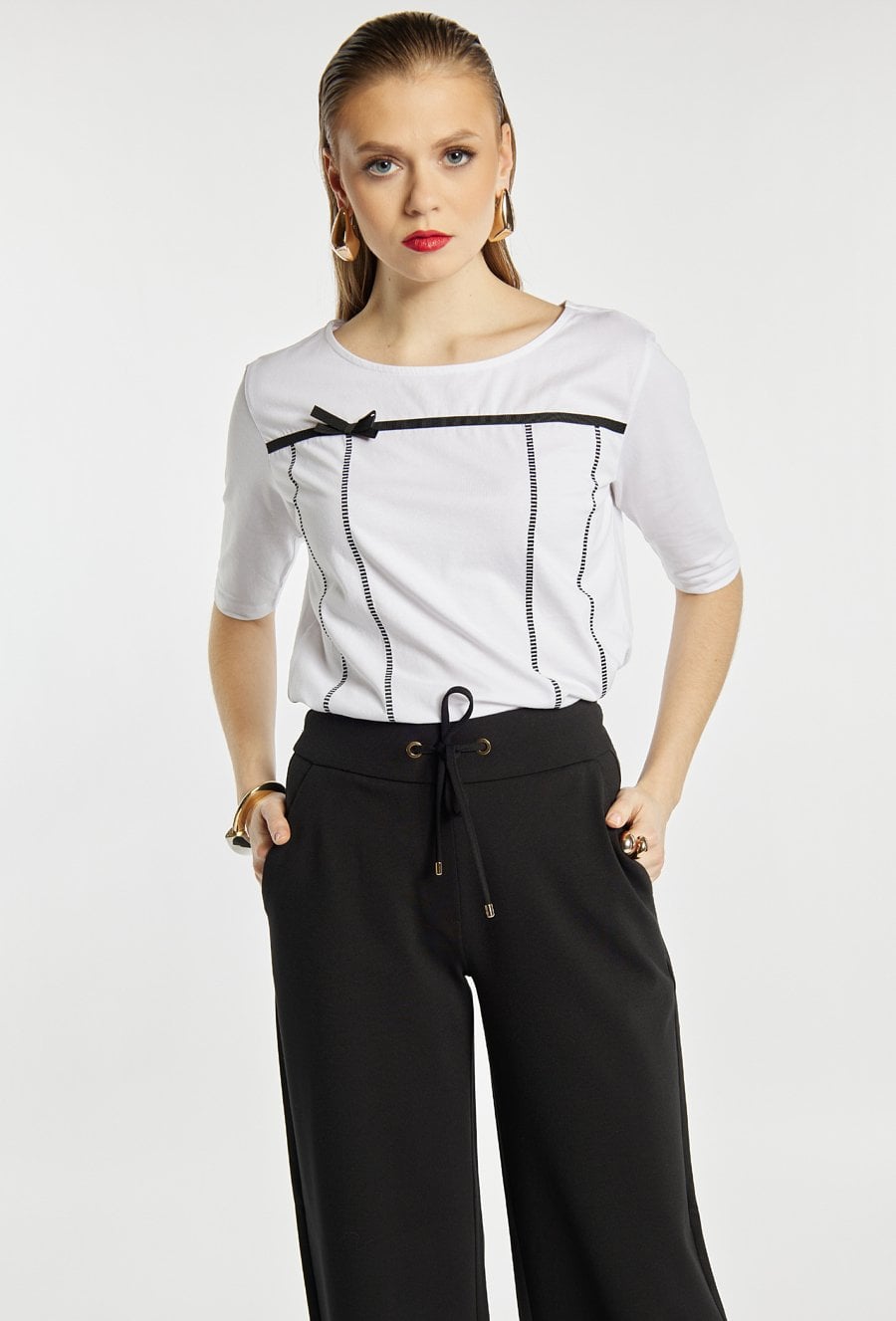 T-shirt damski o klasycznym kroju. T-shirt ma półokrągły dekolt oraz rękawy o długości do łokcia. T-shirt wyróżnia dekoracyjny detal z przodu- pionowe przeszycia oraz cienka tasiemka zakończona małą kokardką, które dodają całości subtelnej elegancji. Idealny do codziennych, lekkich stylizacji. Modelka na zdjęciu ma 177 cm wzrostu i prezentuje rozmiar S.