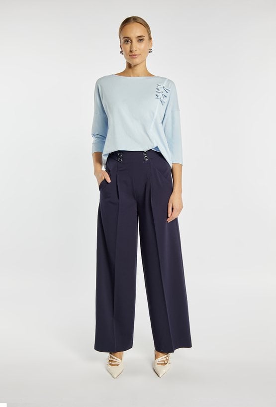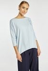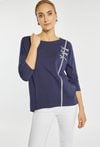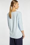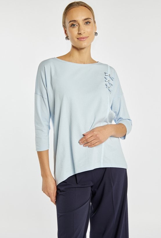 T-shirt z rękawem 3/4 i półokrągłym dekoltem. T-shirt urozmaicony pionową aplikacją z drobnych koralików oraz ozdobnymi kokardkami, które dodają całości subtelnego, efektownego wykończenia. Model ten świetnie sprawdzi się do wiosennych stylizacji. Modelka na zdjęciu ma 177 cm wzrostu i prezentuje rozmiar S.
