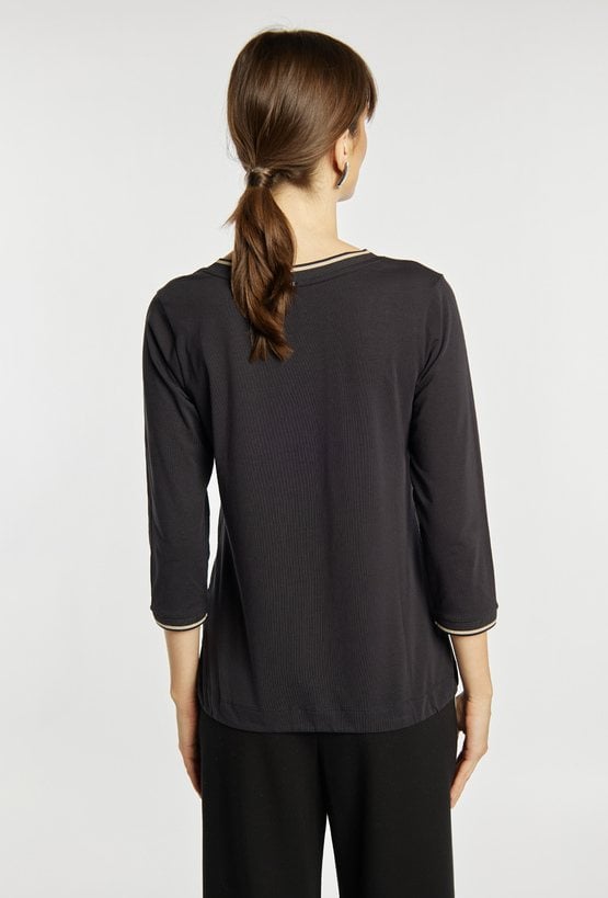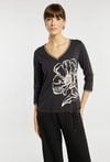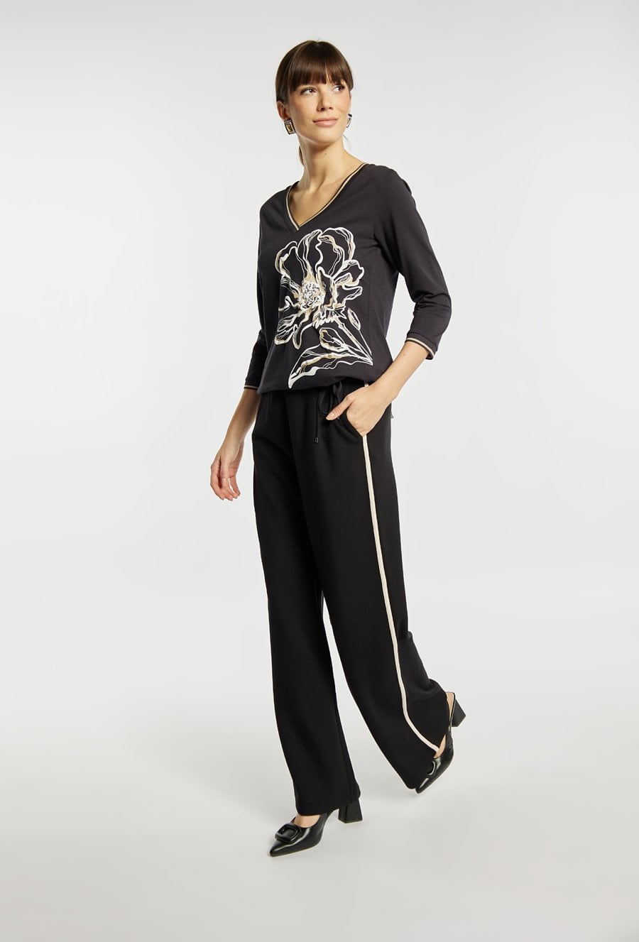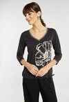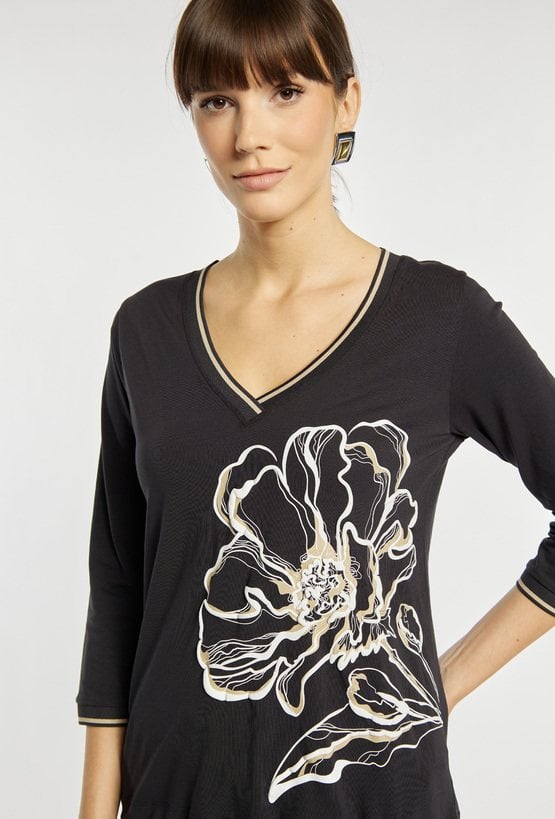 T-shirt damski o swobodnym fasonie. Model z dekoltem w serek oraz rękawami o długości 3/4, wykończonymi delikatną lamówką. Z przodu ozdobiony efektownym, dużym motywem kwiatowym, który nadaje całości eleganckiego i kobiecego charakteru. Idealny do codziennych i półeleganckich stylizacji. Modelka na zdjęciu ma 177 cm wzrostu i prezentuje rozmiar S.