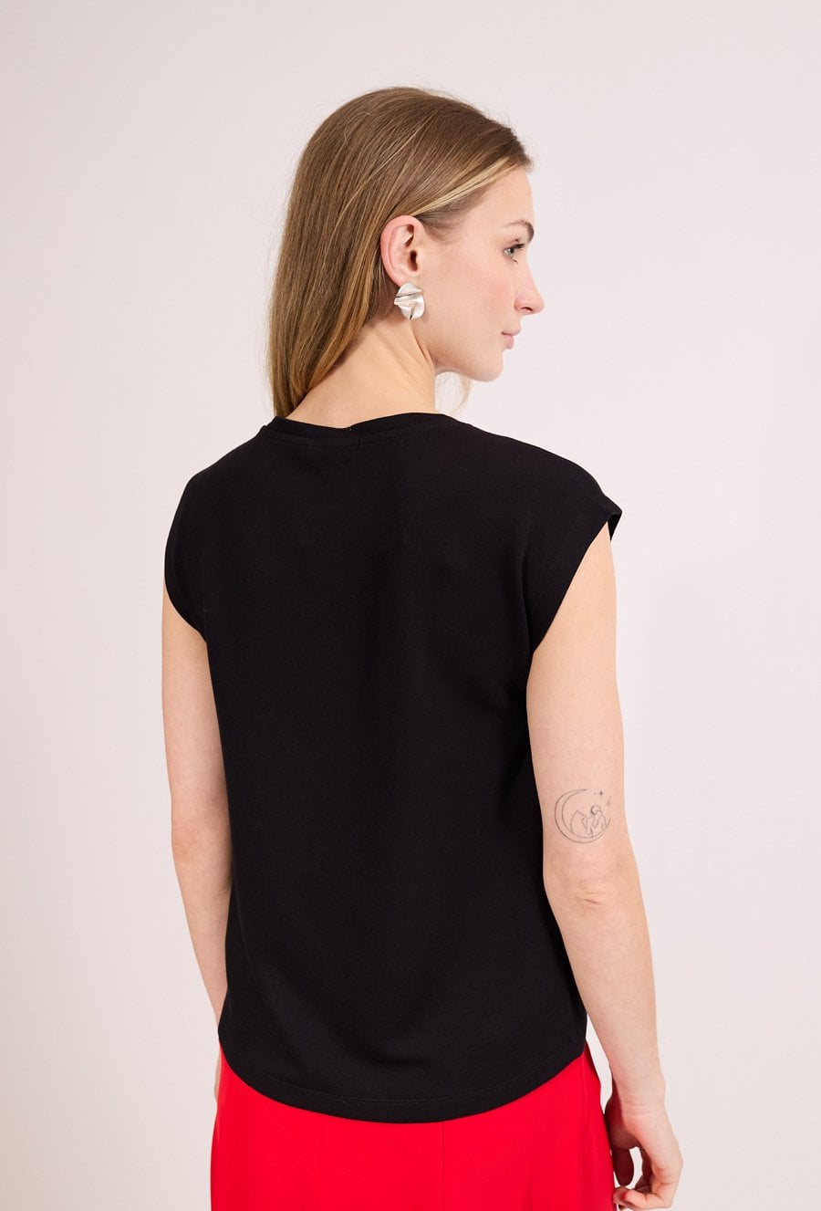 T-shirt damski o luźnym kroju bez rękawów. Model z dekoltem w kształcie litery V, który podkreśla sylwetkę i nadaje całości kobiecego charakteru. T-shirt doskonale sprawdzi się w codziennych i casualowych stylizacjach, na spotkania oraz letnie wyjścia. Modelka na zdjęciu ma 177 cm wzrostu i prezentuje rozmiar S.