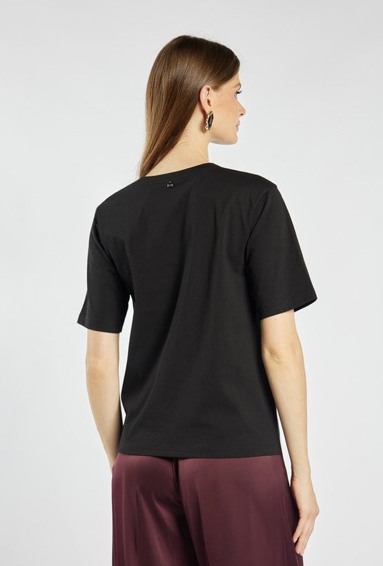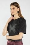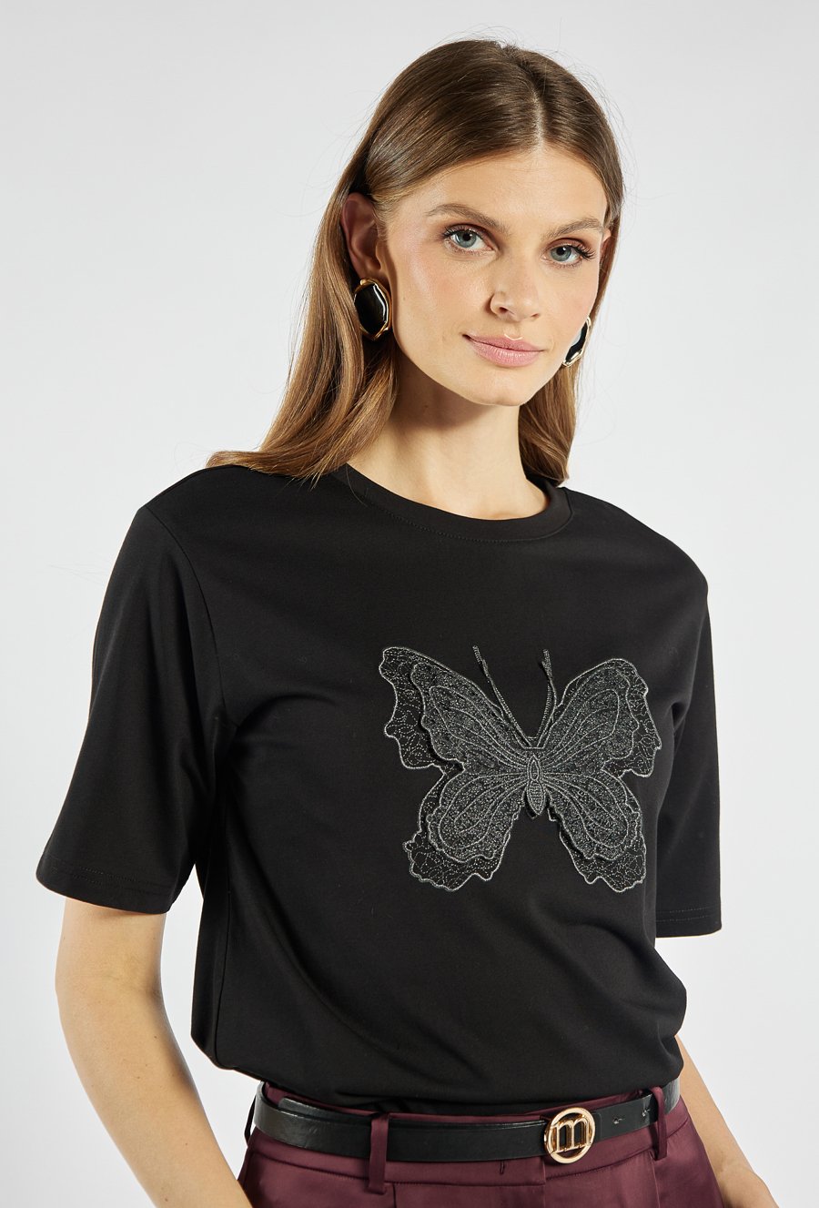 T-shirt damski z krótkim rękawem, ozdobiony efektowną aplikacją motyla z delikatnym połyskiem. T-shirt z krótkim rękawem oraz półokrągłym dekoltem. Model ten sprawdzi się na co dzień, ale także w bardziej eleganckich stylizacjach. Modelka na zdjęciu ma 177 cm wzrostu i prezentuje rozmiar S.
