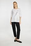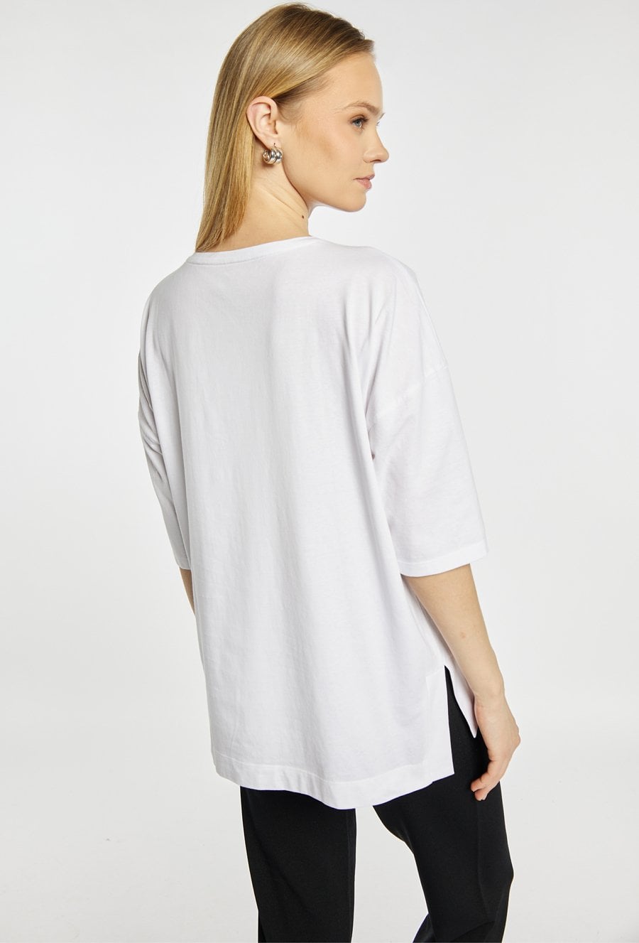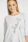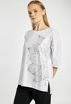 T-shirt damski o luźnym fasonie. . Model z okrągłym dekoltem oraz rękawami o długości 3/4. Z przodu ozdobiony subtelnym, dużym motywem liścia, który nadaje całości eleganckiego i nowoczesnego charakteru. Modelka na zdjęciu ma 177 cm wzrostu i prezentuje rozmiar S.