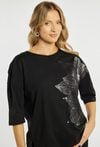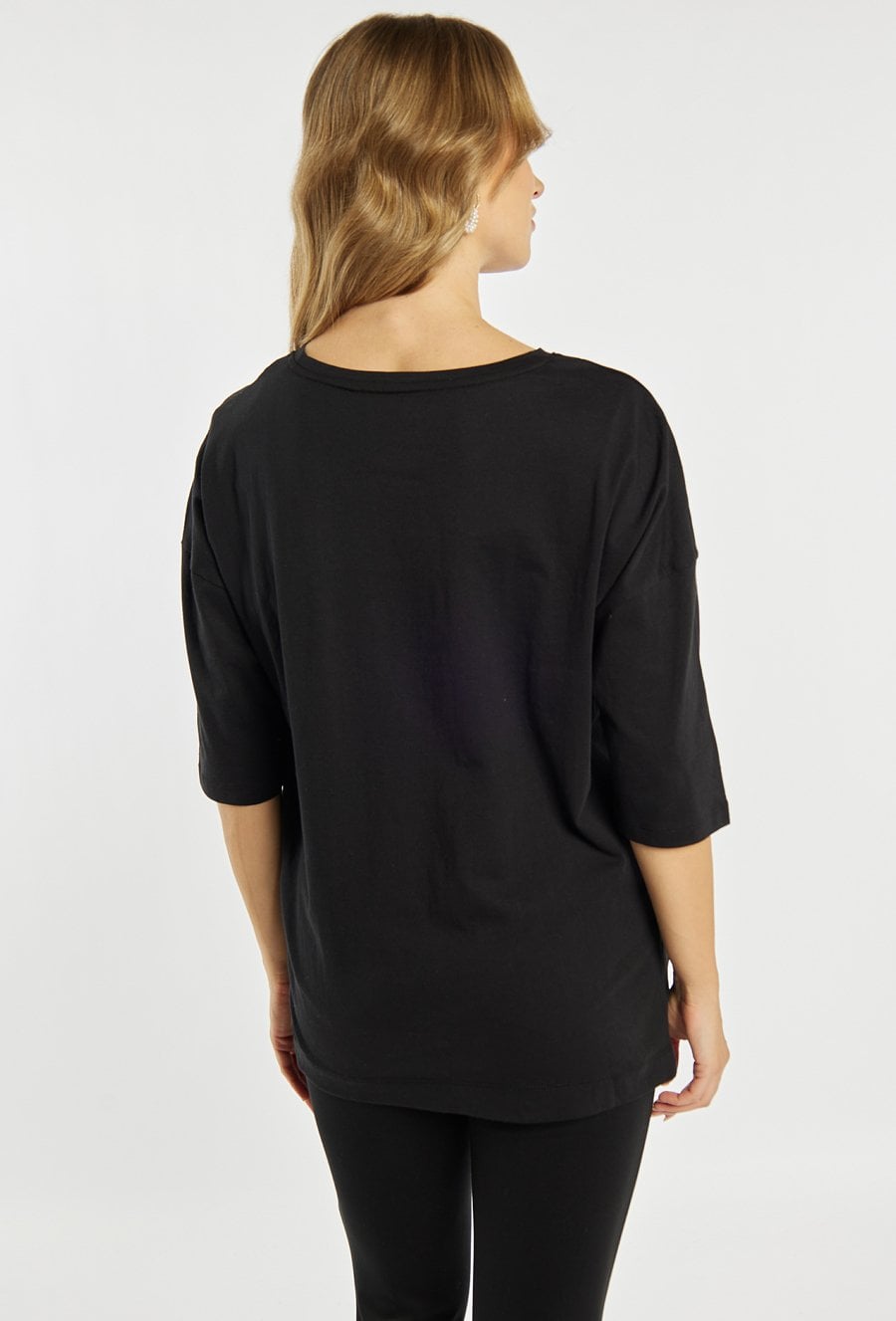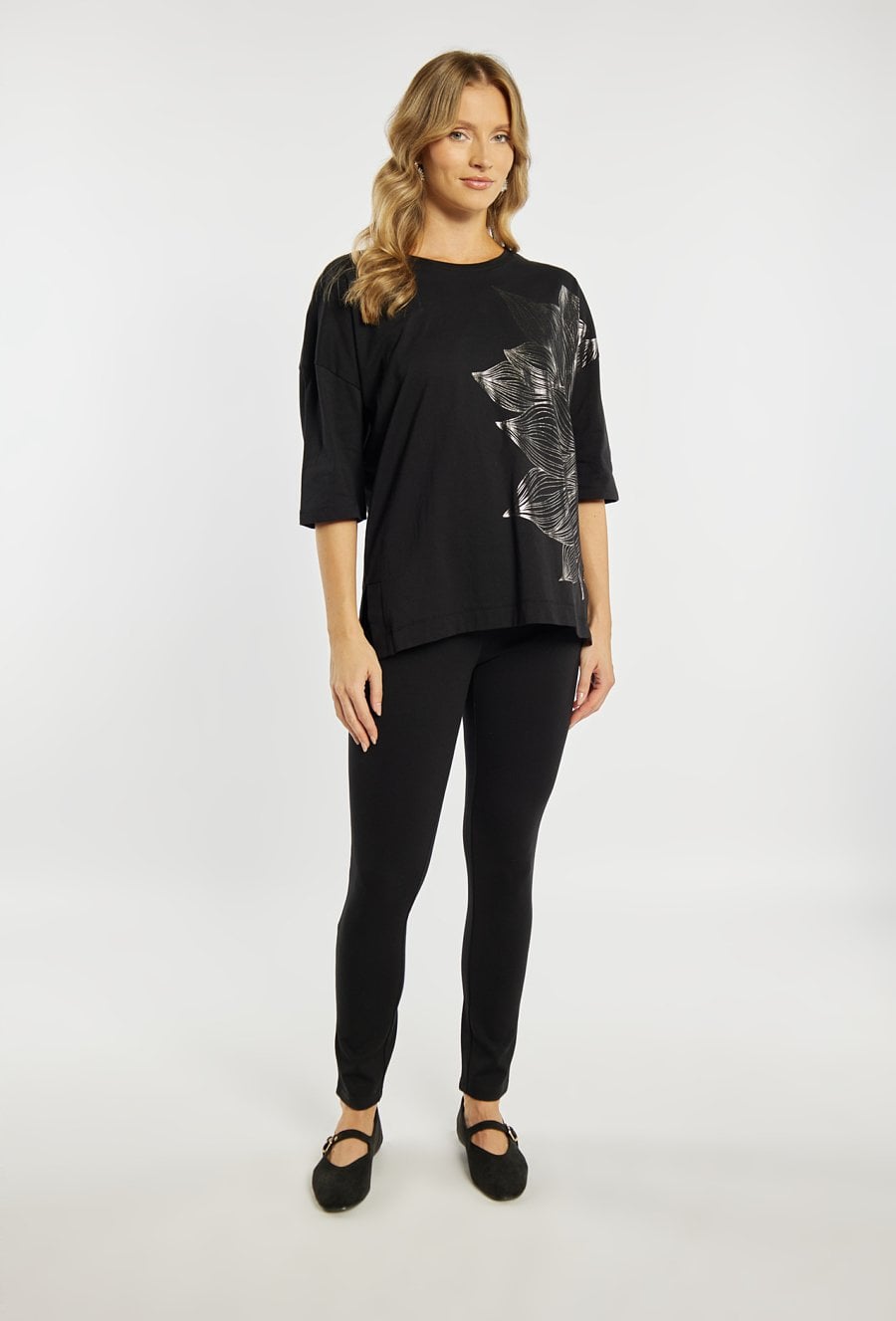 T-shirt damski o luźnym fasonie. . Model z okrągłym dekoltem oraz rękawami o długości 3/4. Z przodu ozdobiony subtelnym, dużym motywem liścia, który nadaje całości eleganckiego i nowoczesnego charakteru. Modelka na zdjęciu ma 177 cm wzrostu i prezentuje rozmiar S.