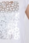 T-shirt damski o swobodnym, komfortowym kroju. Model z krótkim rękawem oraz klasycznym, zaokrąglonym dekoltem. Przód zdobi efektowny nadruk z połyskującym wykończeniem, który nadaje koszulce nowoczesnego i stylowego charakteru. Damski T-shirt doskonale sprawdzi się w codziennych stylizacjach. Modelka na zdjęciu ma 177 cm wzrostu i prezentuje rozmiar S.