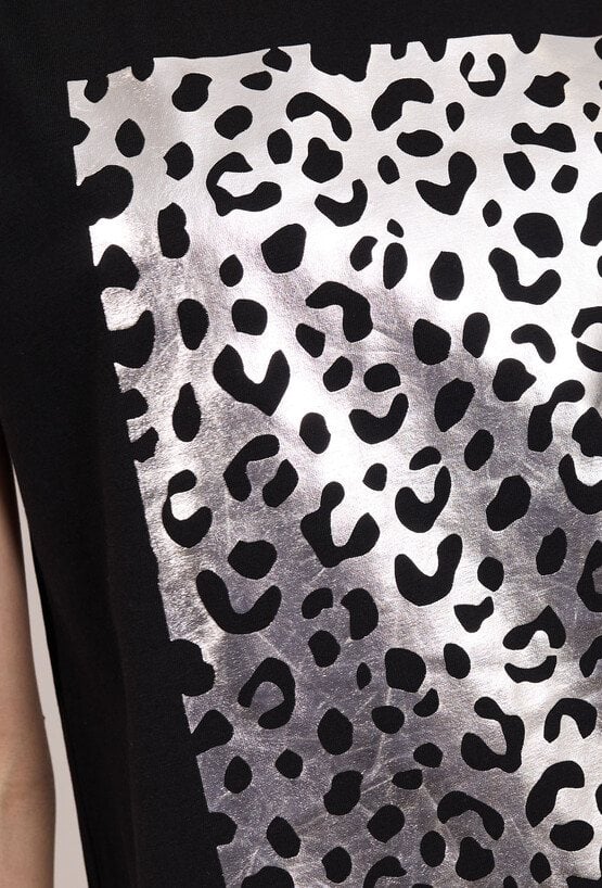 T-shirt damski o swobodnym, komfortowym kroju. Model z krótkim rękawem oraz klasycznym, zaokrąglonym dekoltem. Przód zdobi efektowny nadruk z połyskującym wykończeniem, który nadaje koszulce nowoczesnego i stylowego charakteru. Damski T-shirt doskonale sprawdzi się w codziennych stylizacjach. Modelka na zdjęciu ma 177 cm wzrostu i prezentuje rozmiar S.