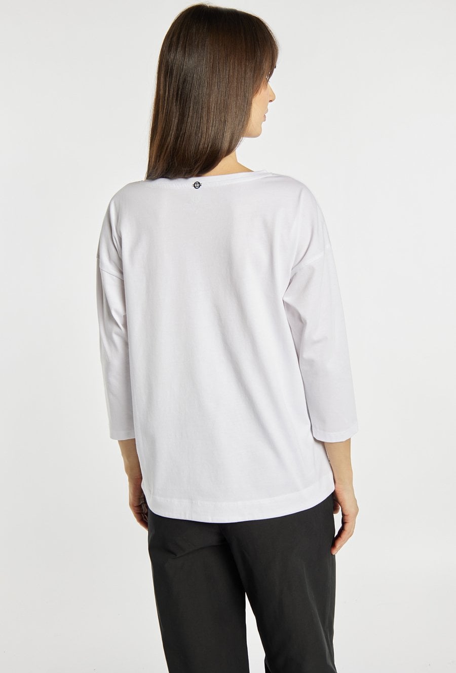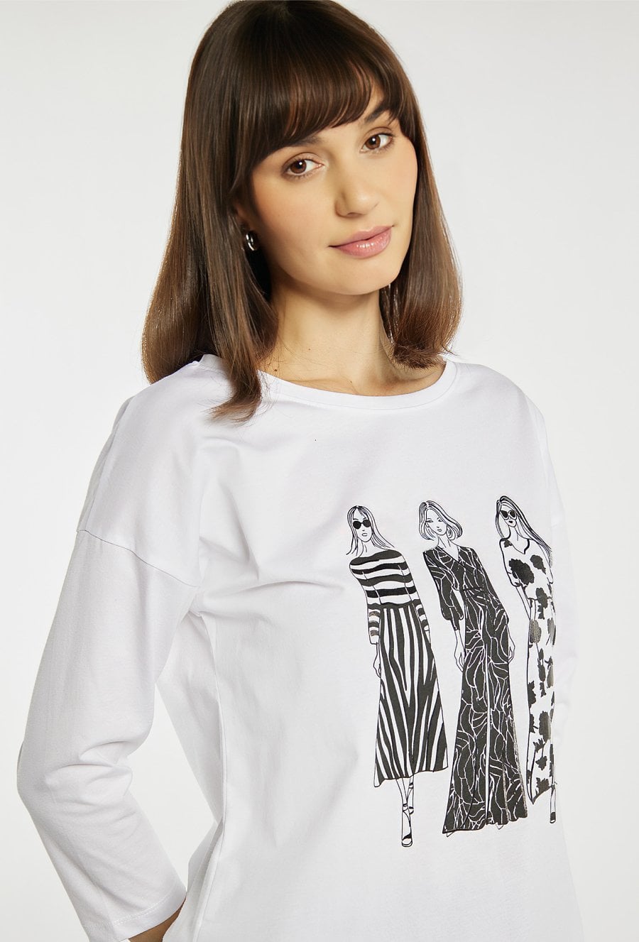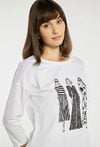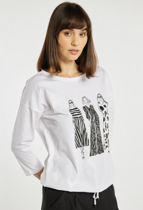 T-shirt o swobodnym, prostym kroju, który zapewnia wygodę noszenia na co dzień. T-shirt wyróżnia się efektownym nadrukiem przedstawiającym sylwetki kobiet w kontrastowych wzorach, co nadaje całości nowoczesnego charakteru. Model z klasycznym, okrągłym dekoltem i rękawem o długości 3/4. Modelka na zdjęciu ma 177 cm wzrostu i prezentuje rozmiar S.
